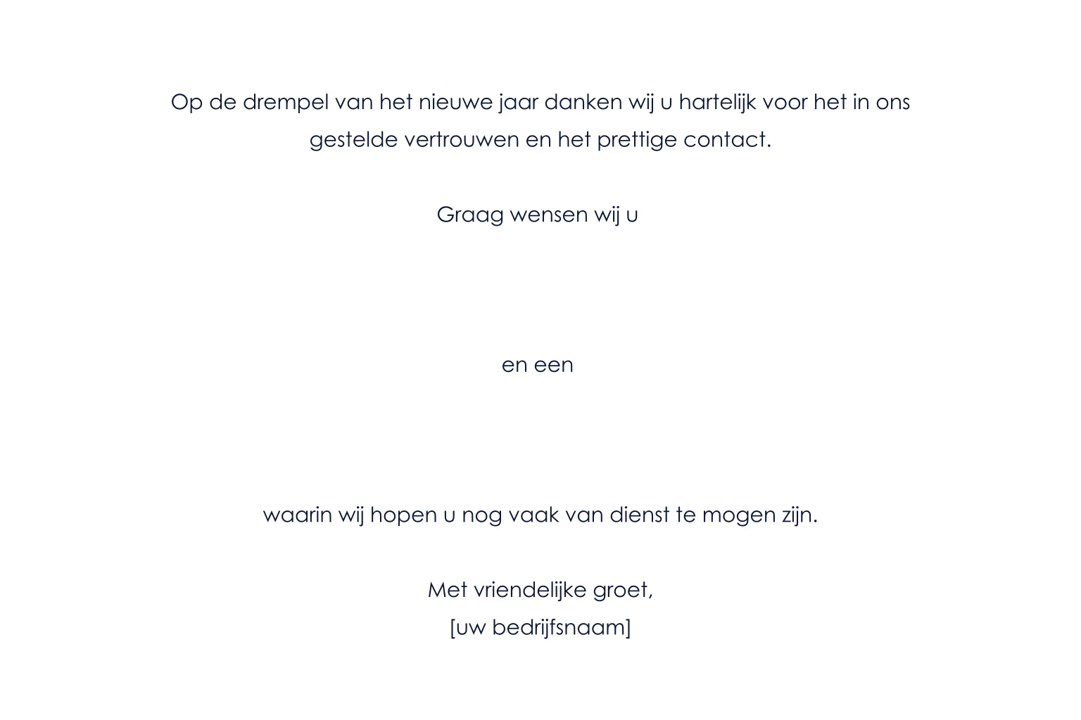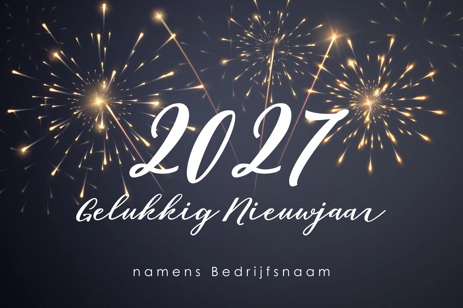 Feestelijke nieuwjaarskaart in donkerblauw met sprankelend vuurwerk en goudfolie jaartal 2027. Wens uw zakelijke relaties een goed nieuwjaar toe met deze sfeervolle en chique kaart. Pas de lettertypes eventueel aan in onze editor.