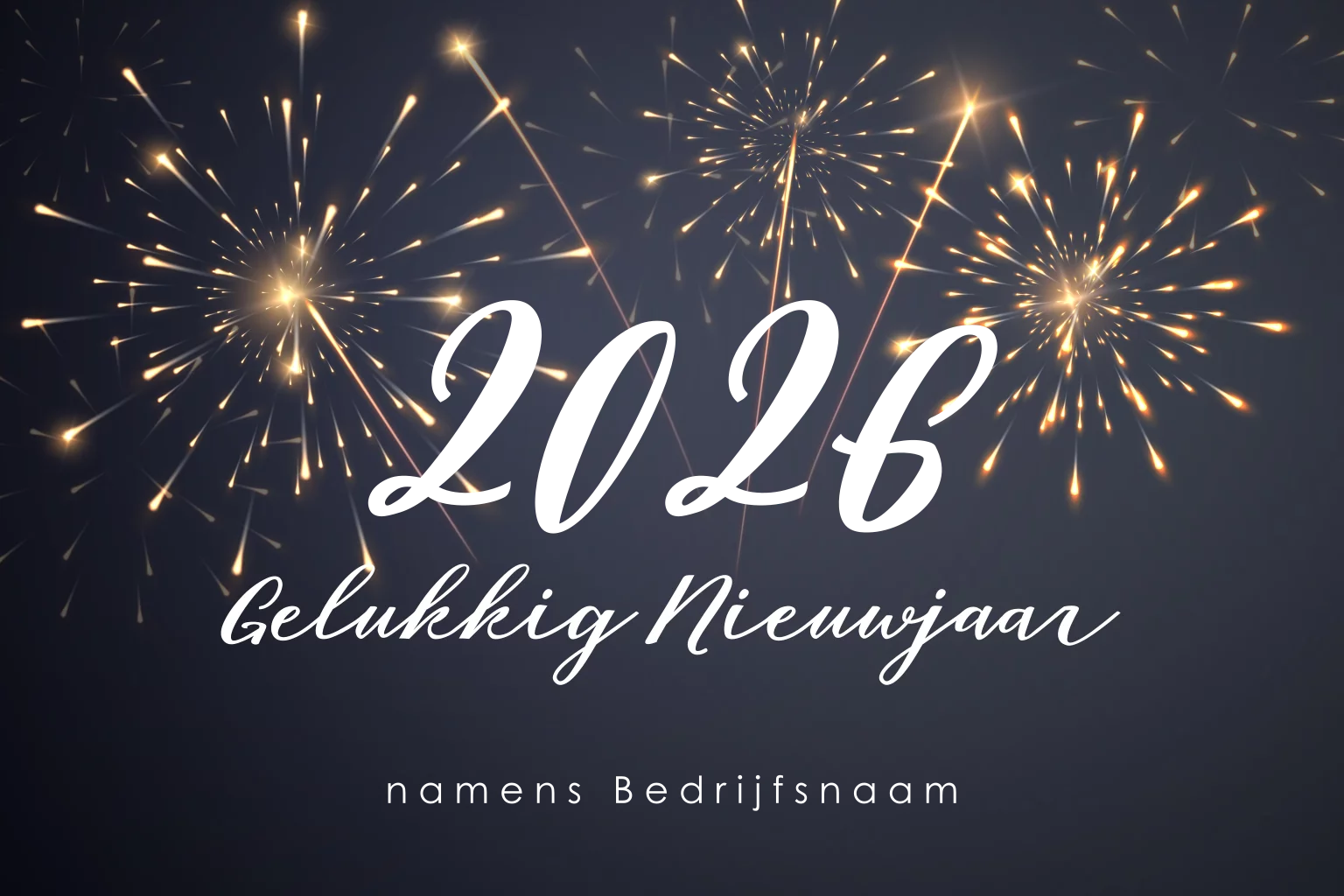 Feestelijke nieuwjaarskaart in donkerblauw met sprankelend vuurwerk en goudfolie jaartal 2026. Wens uw zakelijke relaties een goed nieuwjaar toe met deze sfeervolle en chique kaart. Pas de lettertypes eventueel aan in onze editor.