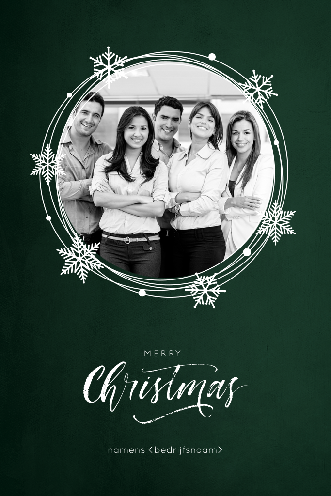 Deze zakelijke kerstkaart heeft een donkergroene achtergrond met rond kader waar u een mooie foto kunt plaatsen. Rond de foto speelse cirkels met ijssterren in goudfolie. Vervang de foto door een eigen foto van bijvoorbeeld uw personeel.