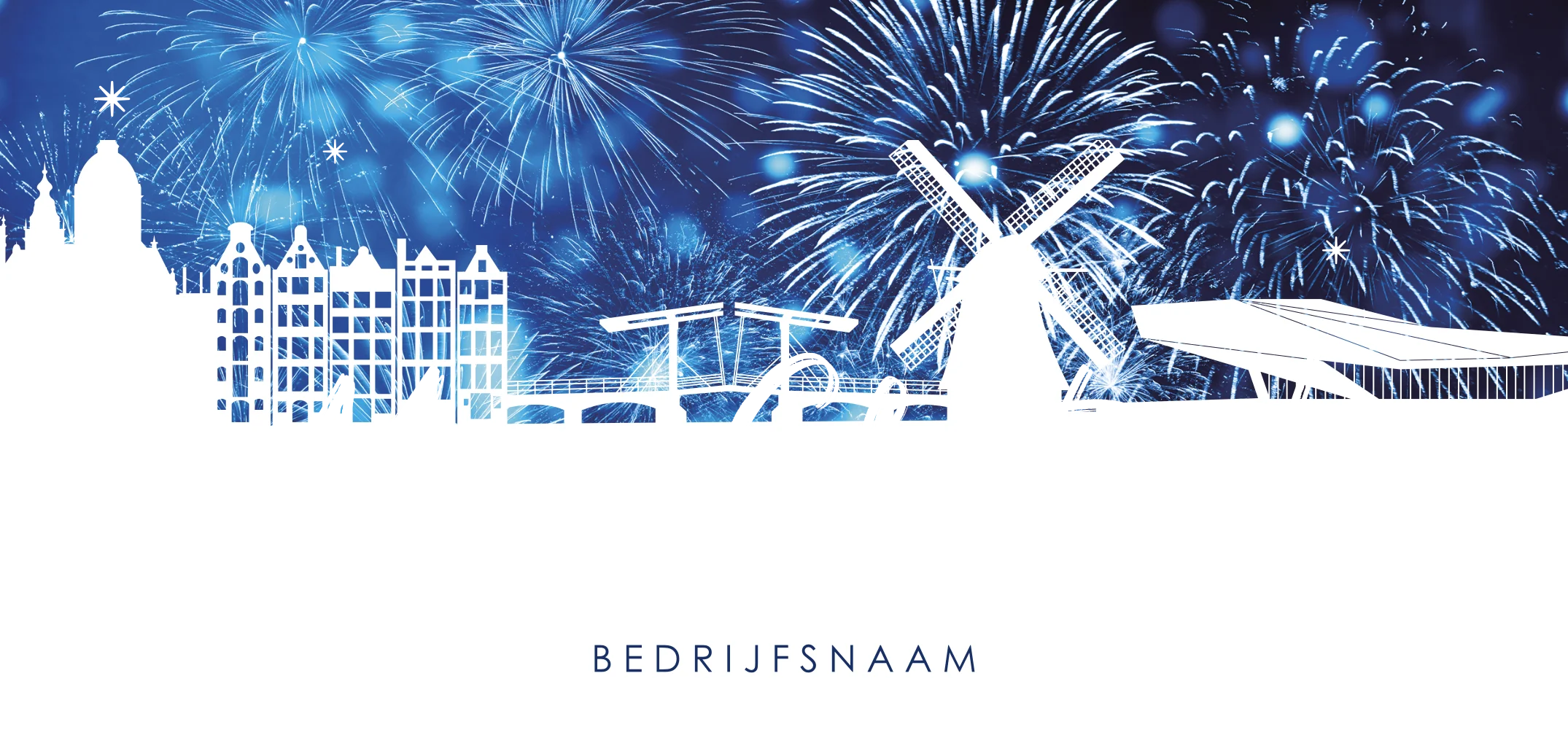 Deze zakelijke kerstkaart omarmt de prachtige skyline van Amsterdam, waar traditie en innovatie samenkomen. Het vuurwerk, schitterend in blauwe tinten, symboliseert de bruisende energie van de feestdagen en de hoop van een nieuw jaar. De afbeelding van Amsterdam herinnert ons aan de rijke geschiedenis en de inspirerende toekomst die voor ons ligt. Deze kaart is meer dan een groet; het is een viering van de verbindingen die we hebben gemaakt en de vreugde van het seizoen. De goudfolie typografie maakt het geheel feestelijk af.