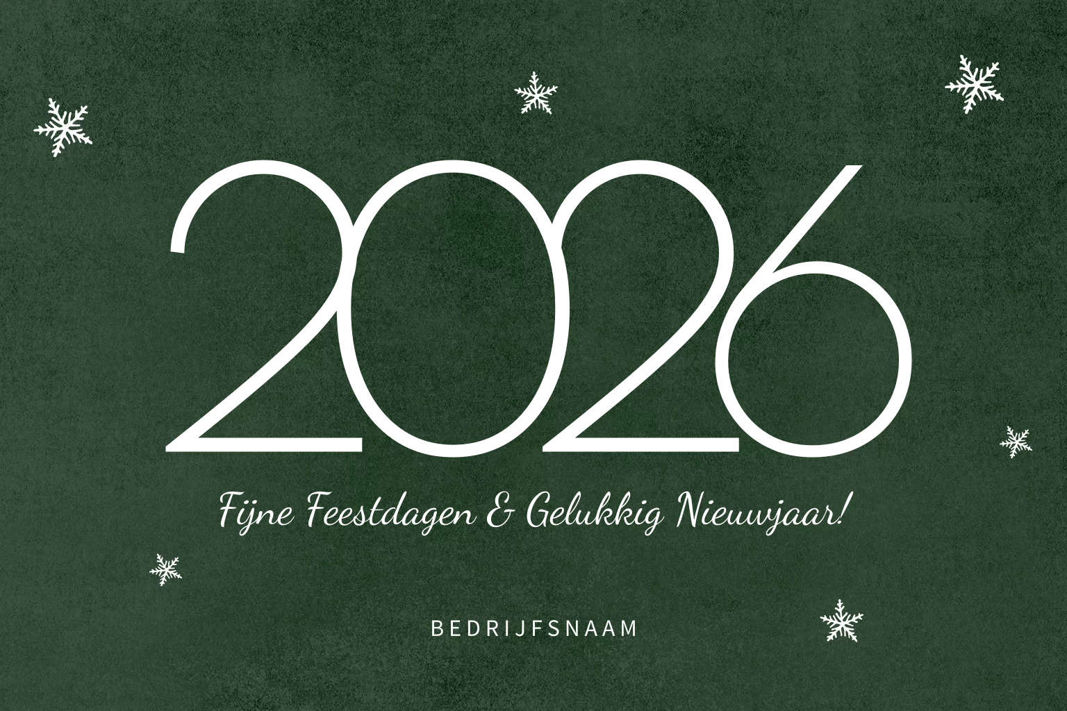 Donkergroene kerstkaart met goudfolie 2026 en typografie. Stijlvolle kerstkaart met groene achtergrond. Dit zakelijke ontwerp is extra mooi door de combinatie van het donkergroen met de gouden glans van het jaartal in het midden van de kaart. In de kaart is ruimte voor het logo en een tekst die je speciaal voor je zakenrelaties kunt plaatsen. Bestel een drukproef en bekijk de kaart in het echt.