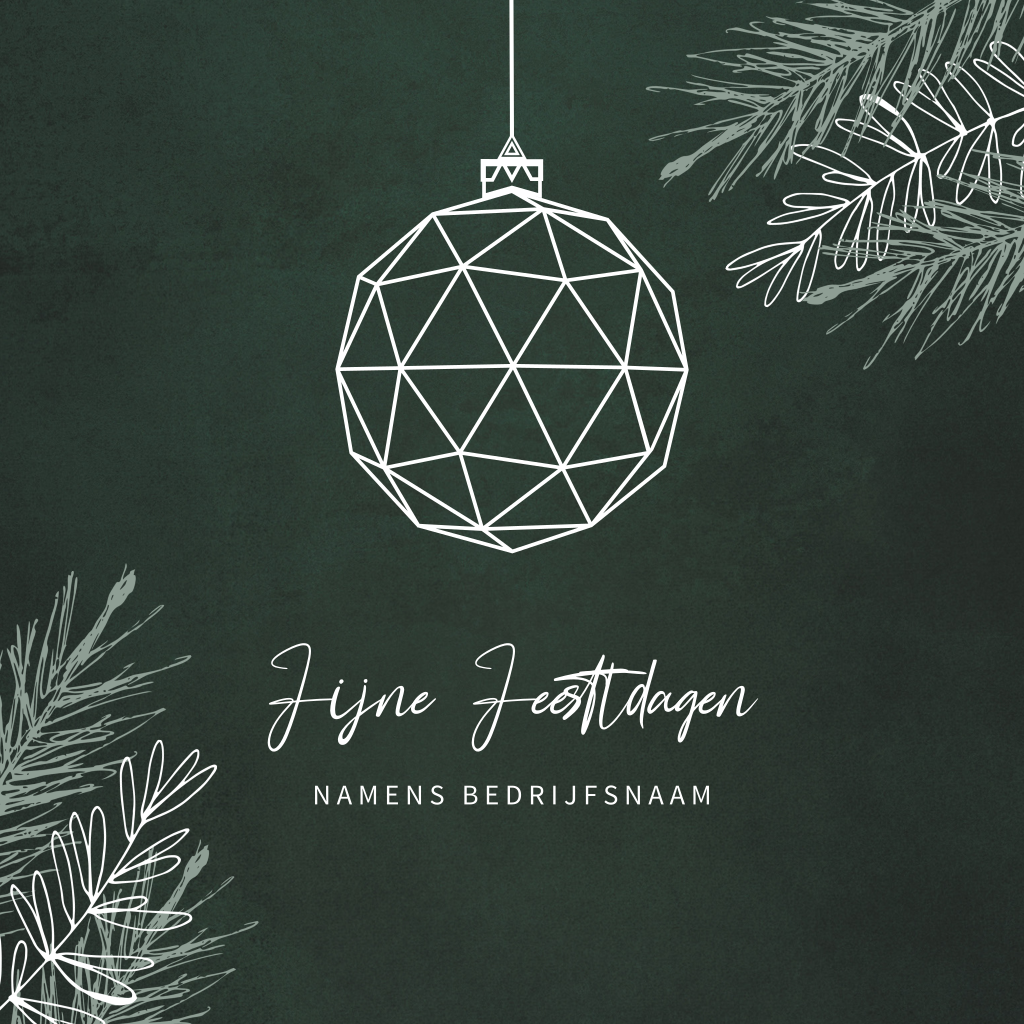 Groene kerstkaart met grafische kerstbal in goudfolie met bladeren. Mooie kerstkaart op vierkant formaat. Dit sprankelende ontwerp is extra mooi door de gouden accenten met echt goudfolie, zoals de grafische kerstbal. De bladeren en takjes maken het ontwerp helemaal af. In de kaart is ruimte voor uw bedrijfslogo en een korte tekst.