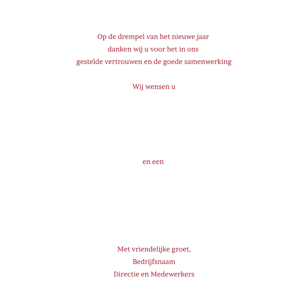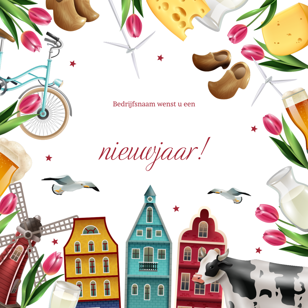 Op zoek naar een kerstkaart met Hollands tintje? Ga voor dit vrolijke ontwerp met goudfolie en allerlei Nederlandse iconen. Denk aan een koe, fiets, kaas, tulpen, (wind)molens en meer! Hollandser gaat het niet worden. Wens uw zakelijke contacten een gelukkig nieuwjaar met dit kleurrijke en feestelijke kaartje. Pas dit ontwerp eenvoudig zelf aan in onze gebruiksvriendelijke editor.