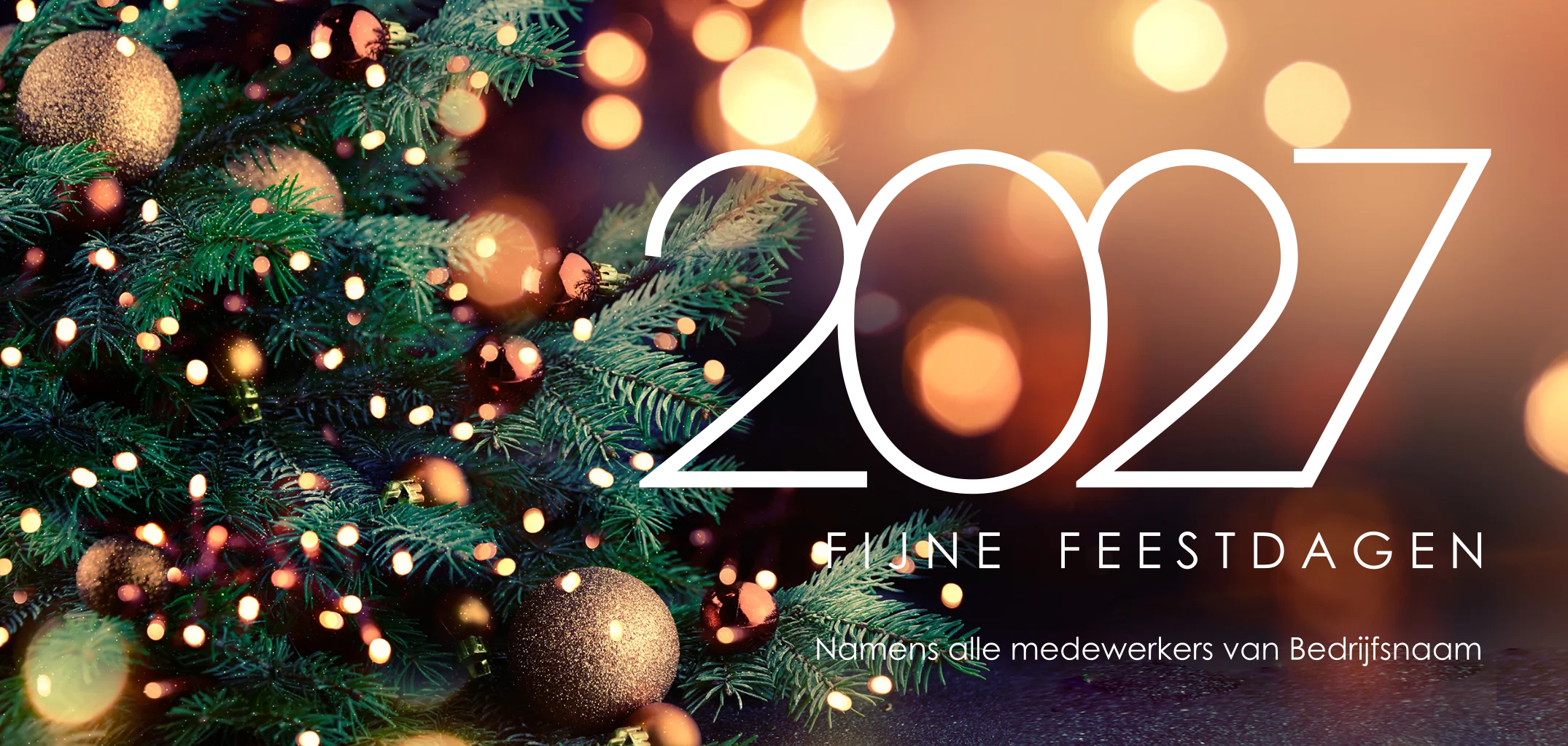 Chique kerstkaart met 2027 in goudfolie en sfeervolle foto van dennentakken. Wilt u dit jaar een extra stijlvolle kerstkaart versturen? Kies dan voor een ontwerp met goudfolie voor extra klasse en glans. In de kaart is ruimte voor het logo en een persoonlijke tekst.