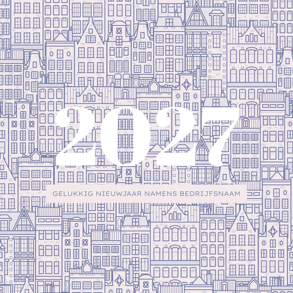 Zakelijke kerstkaart met patroon van Hollandse grachtenpanden en huizen in blauwe kleur. Voorop staat groot 2027 in goudfolie cijfers. Wens uw zakelijke contacten een gelukkig nieuwjaar met deze originele kaart. Pas het ontwerp zelf aan in onze editor.