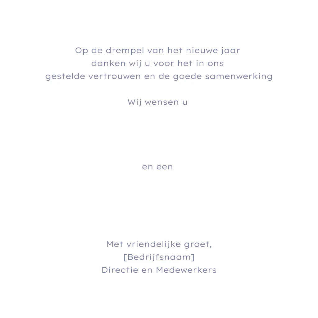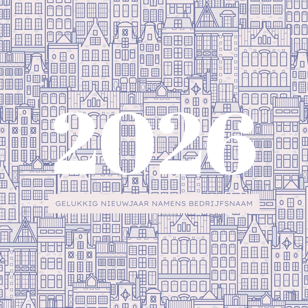Zakelijke kerstkaart met patroon van Hollandse grachtenpanden en huizen in blauwe kleur. Voorop staat groot 2026 in goudfolie cijfers. Wens uw zakelijke contacten een gelukkig nieuwjaar met deze originele kaart. Pas het ontwerp zelf aan in onze editor.
