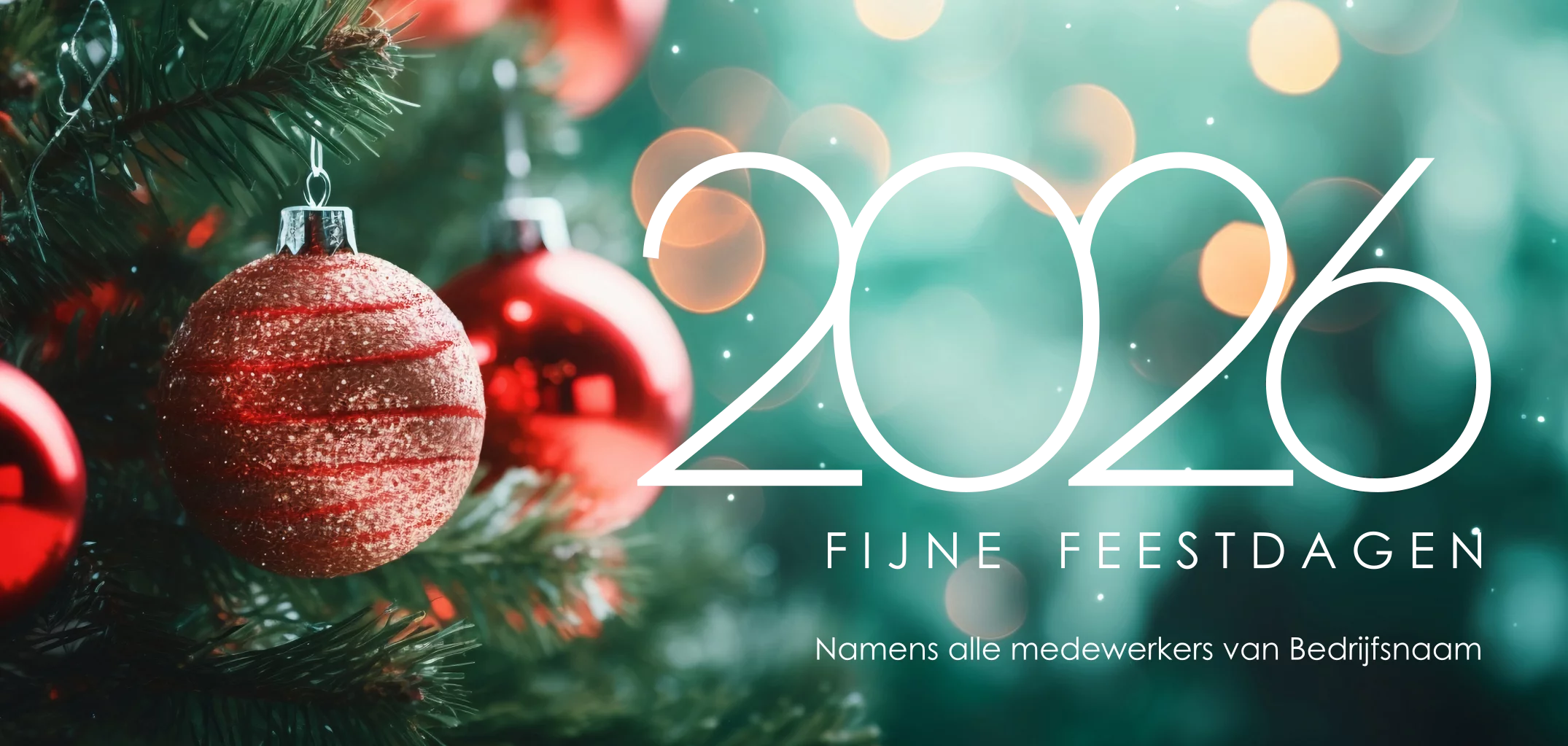 Sprankelende kerstkaart met jaartal in roségoudfolie en sfeervolle, kleurrijke foto van rode kerstballen in een kerstboom. Wilt u dit jaar een extra stijlvolle kerstkaart versturen? Kies dan voor een ontwerp met roségoudfolie voor extra klasse en glans. In de kaart is ruimte voor het logo en een persoonlijke tekst.