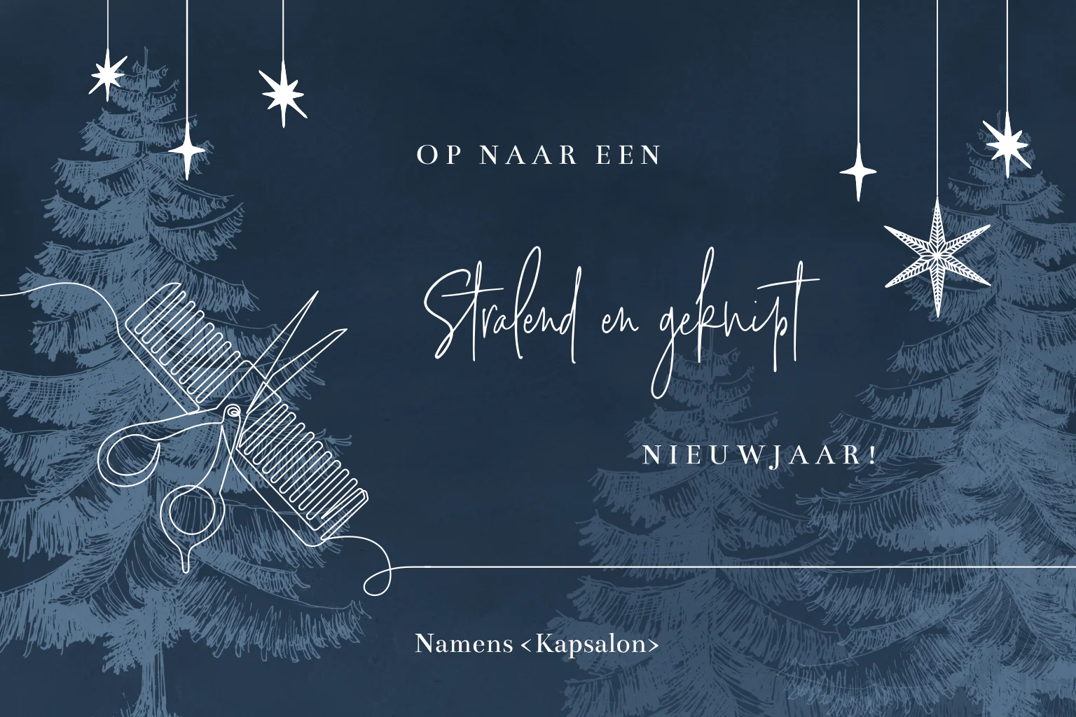 Stijlvolle zakelijke kerstkaart speciaal voor kapsalons en kapperszaken. Op de donkerblauwe achtergrond zijn kerstbomen en gouden sterren afgebeeld. In het ontwerp is een goudkleurige lijntekening van een schaar en kam verwerkt, wat zorgt voor een feestelijke en professionele uitstraling. Met de tekst “Op naar een stralend en geknipt nieuwjaar!” is een originele manier om een gelukkig nieuwjaar te wensen met een knipoog naar het vak.
