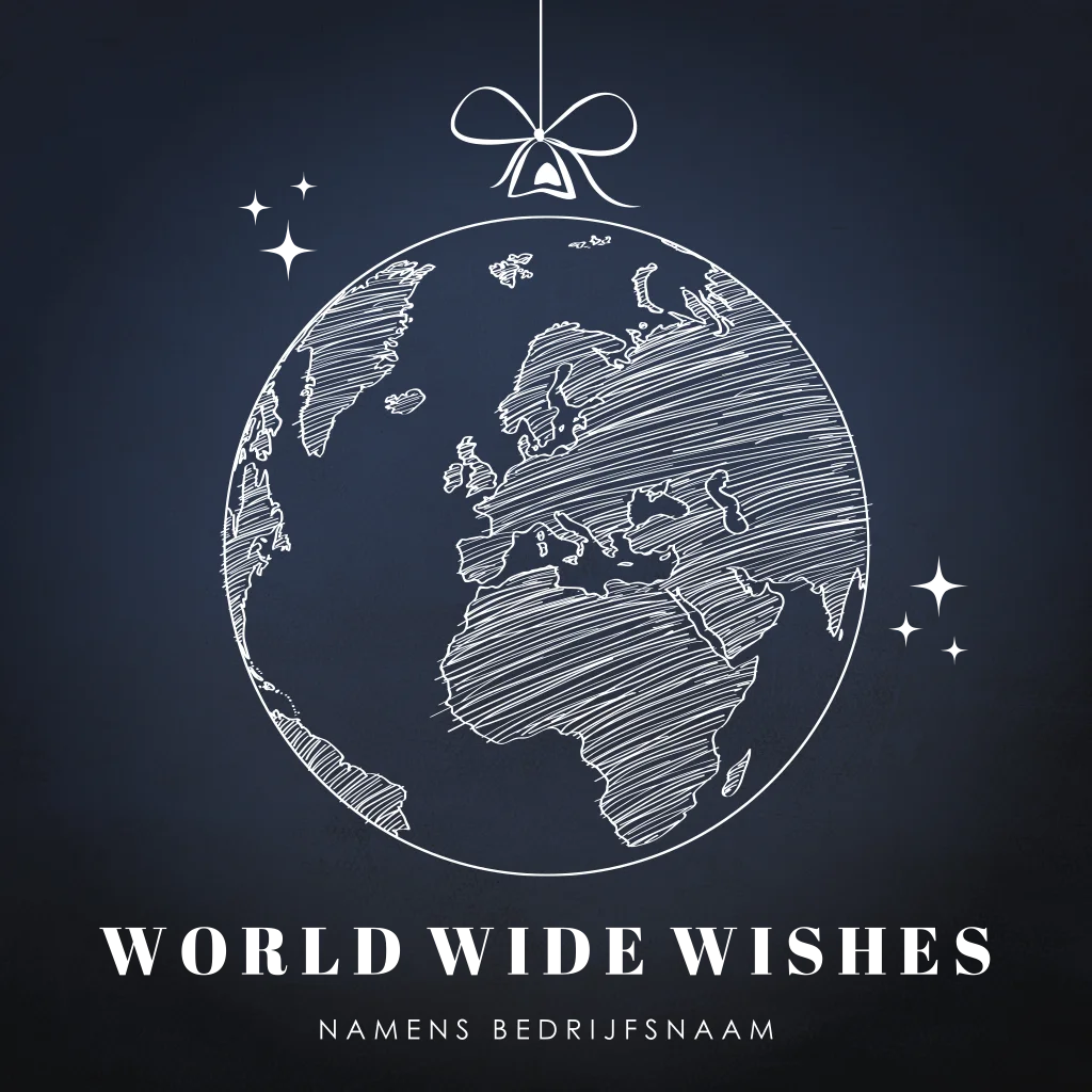 Zakelijke kerstkaart met een donkerblauwe achtergrond met getekende kerstbal als wereldbol in wit en de toepasselijke tekst 'World Wide Wishes' eronder in goudfolie.