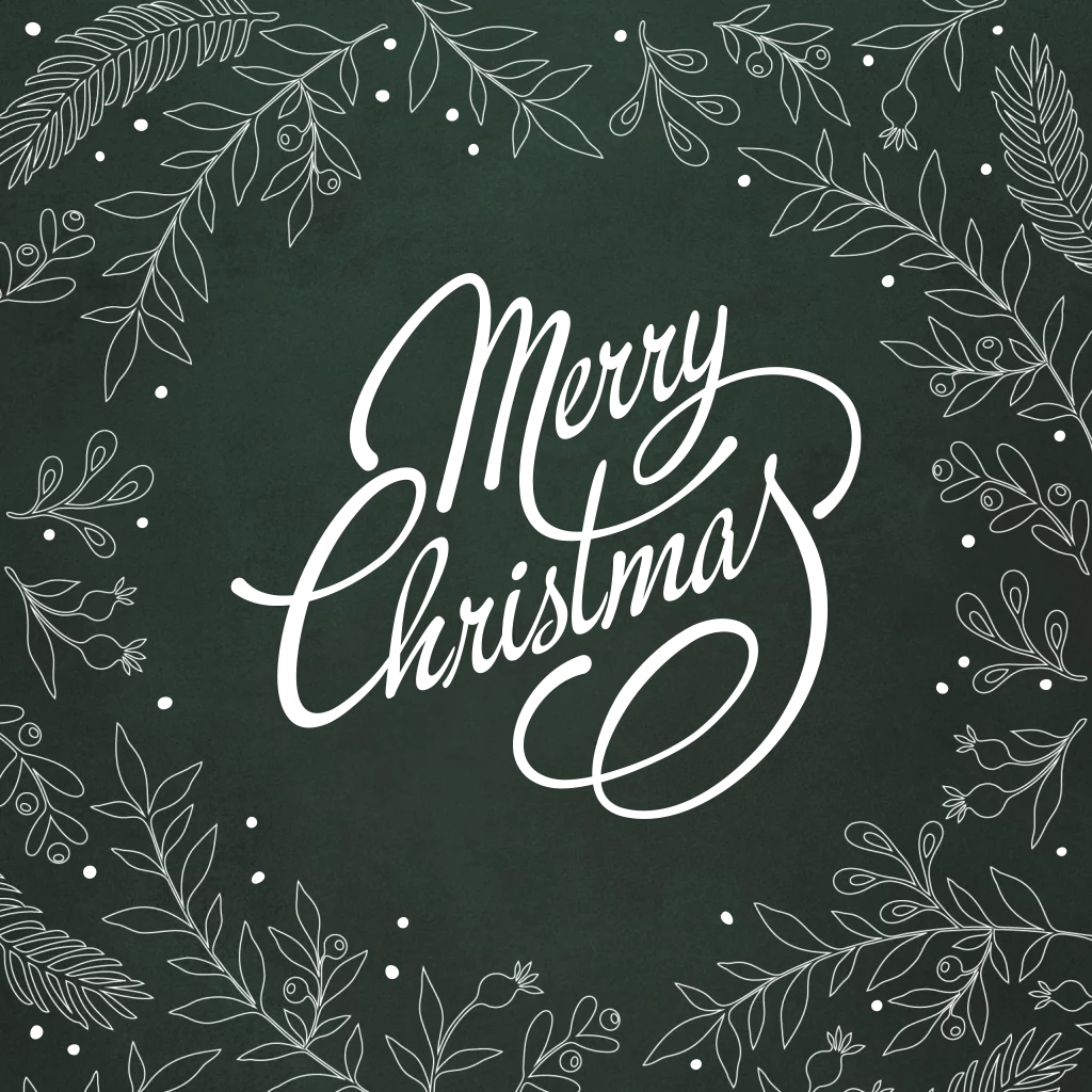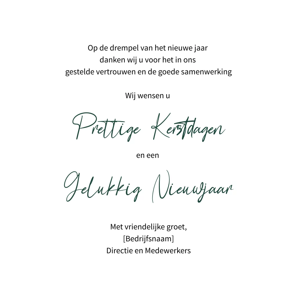 Donkergroene kerstkaart met getekende takken en goudfolie. Mooie donkergroene kerstkaart op vierkant formaat. Dit sprankelende ontwerp is extra mooi door het soort van logo "Merry Christmas" wordt gedrukt met echt goudfolie. De bladeren en takjes maken het ontwerp helemaal af. In de kaart is ruimte voor uw bedrijfslogo en een korte tekst.