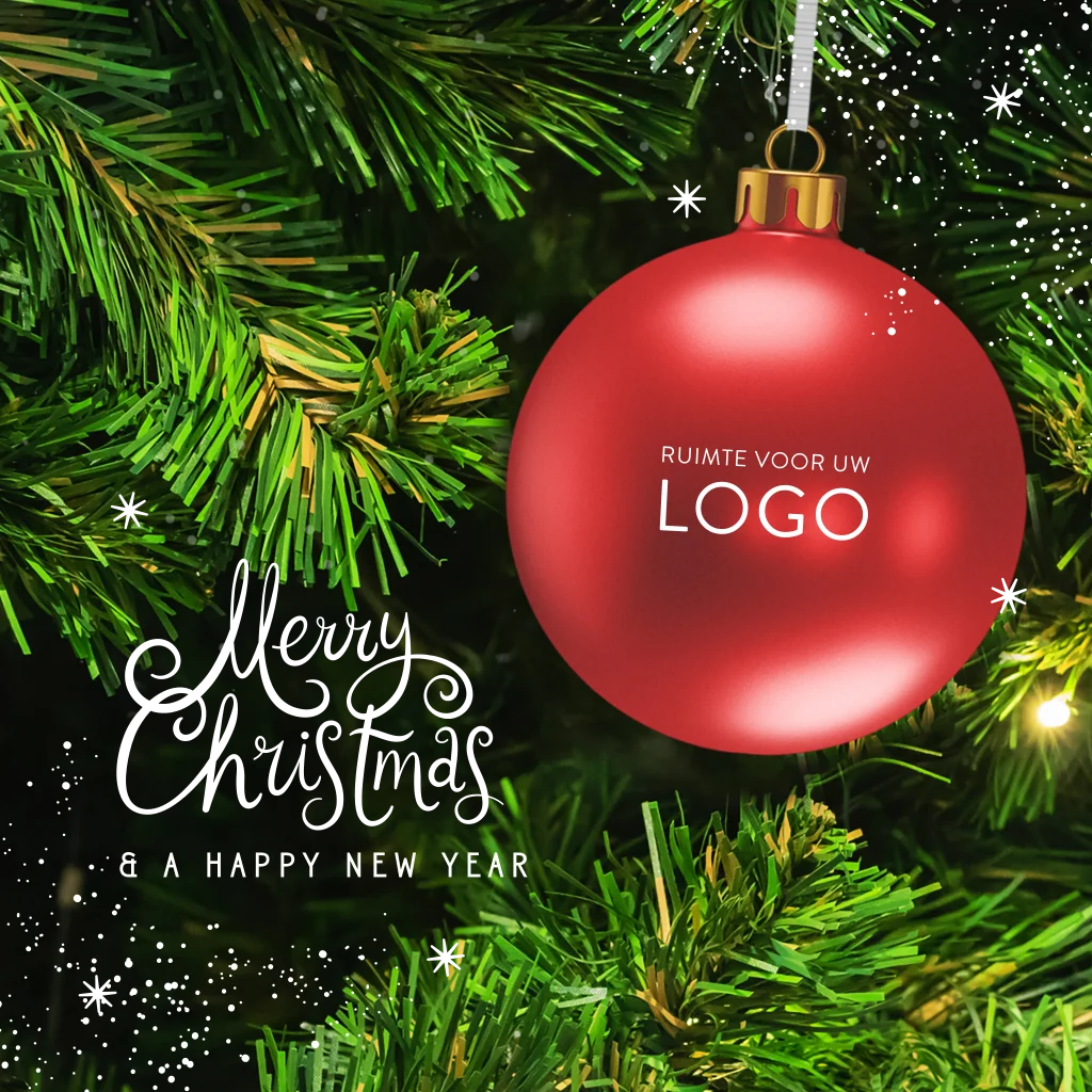 Omarm de kerstsfeer met deze goudfolie kerstkaart met eigen logo. Plaats uw eigen logo op de rode kerstbal om deze kaart te personaliseren. Een perfecte manier om uw goede wensen over te brengen aan al uw zakelijke relaties. In glimmend goudfolie worden er kleine sterretjes op de kaart gedrukt. Ook 'Merry Christmas' in sierlijke letters komt in goudfolie voorop. Pas deze kaart verder aan in onze ontwerptool en bestel een proefdruk om deze in het echt te kunnen bewonderen.