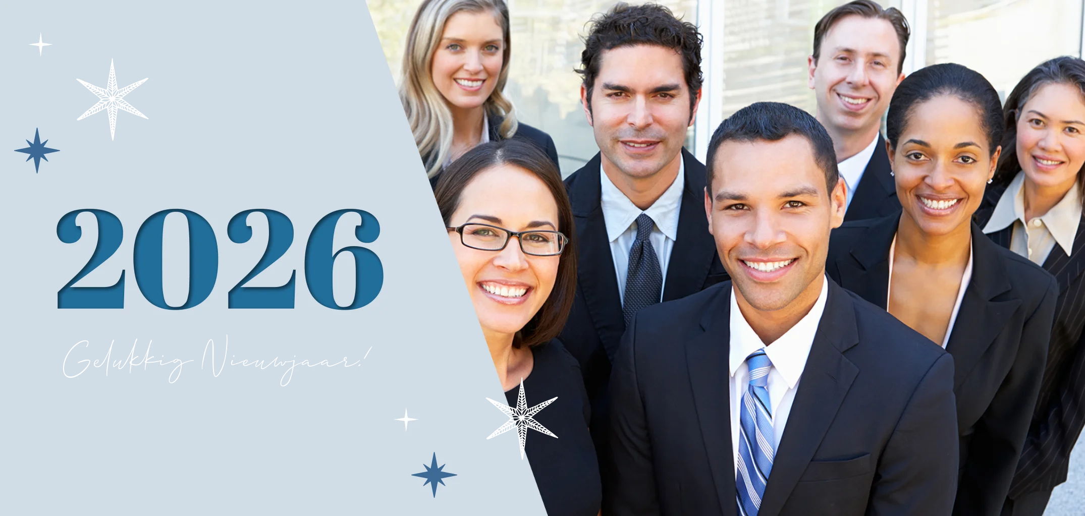 Bent u op zoek naar een stijlvolle en feestelijke kerstkaart waar u een eigen foto op kunt plaatsen? Op dit zachtblauwe ontwerp is ruimte voor een grote foto van uw team (of kantoor). De goudfolie sterren en het blauwe jaartal maken deze zakelijke kerstkaart helemaal af.