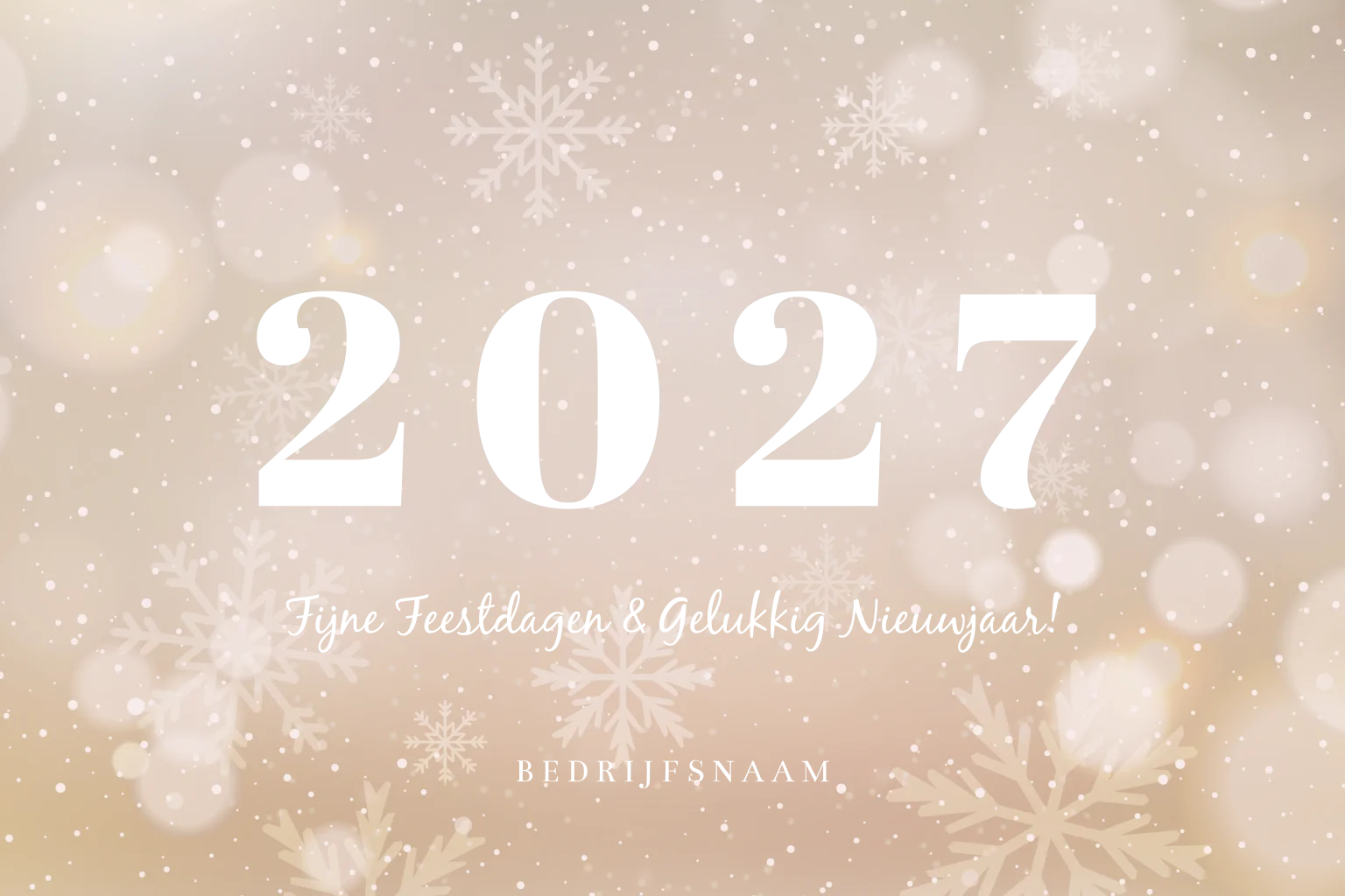 Stijlvolle kerstkaart voor al uw zakelijke contacten. In glimmend koperfolie komt het jaartal 2027 op een beige achtergrond vol lichtjes en sneeuwsterren te staan. Pas deze zakelijke kerstkaart zelf aan in onze editor. Bestel een drukproef en bekijk de kaart in het echt.