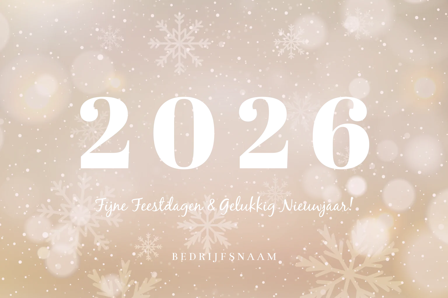 Stijlvolle kerstkaart voor al uw zakelijke contacten. In glimmend roségoudfolie komt het jaartal 2026 op een beige achtergrond vol lichtjes en sneeuwsterren te staan. Pas deze zakelijke kerstkaart zelf aan in onze editor. Bestel een drukproef en bekijk de kaart in het echt.