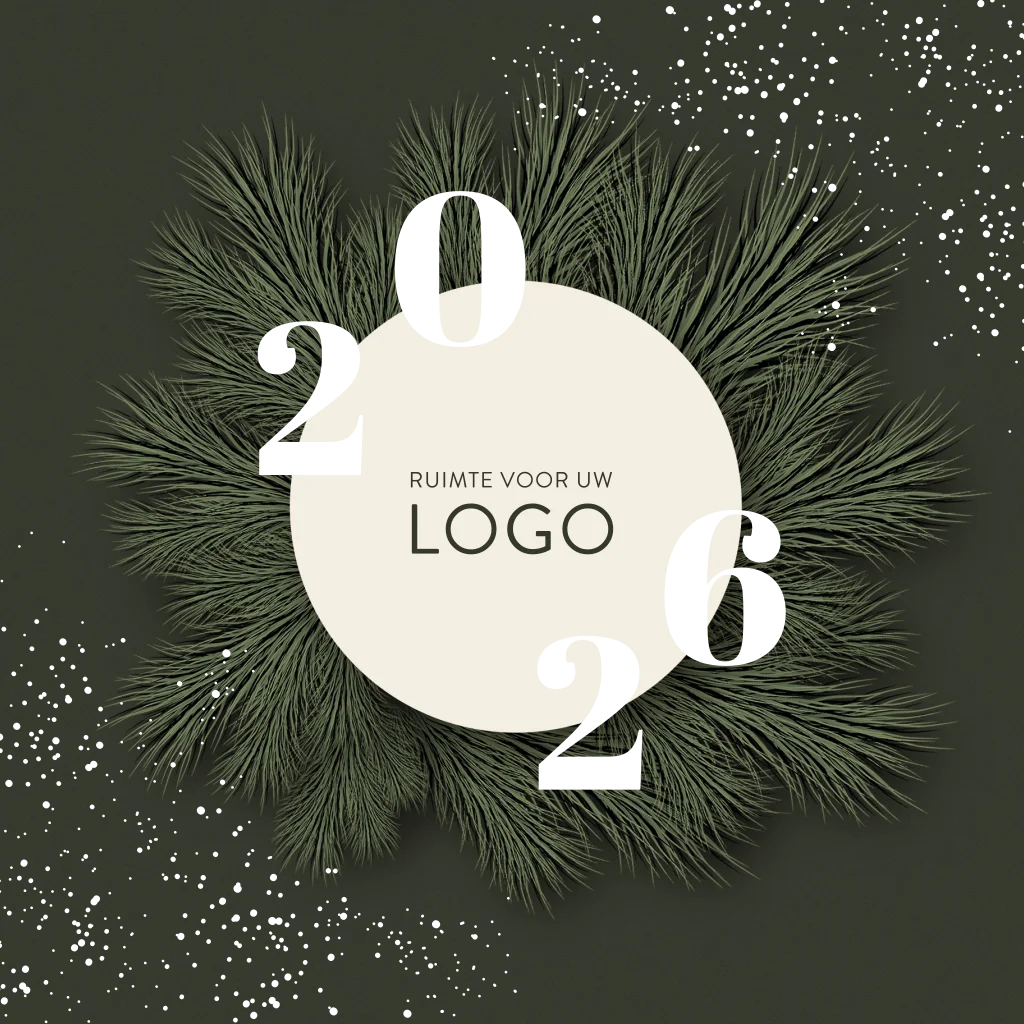 Botanische kerstkaart voor uw zakelijke contacten met goudfolie 2026 en groene dennentakjes. Plaats uw logo in het midden van de kaart. Wens iedereen een prettige kerst en gelukkig nieuwjaar met deze stijlvolle kaart! Deze kerstkaart is verder aan te passen met onze handig editor.