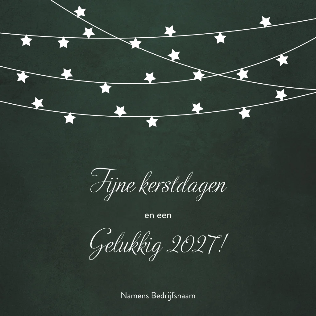 Donkergroene koperfolie kerstkaart met lijnen met lampjes eraan in de vorm van sterren. Mooie chique kerstkaart om naar je zakenrelaties te verzenden. Pas de kaart naar wens aan in de editor en bestel eerst een drukproef om een exemplaar in het echt te zien.