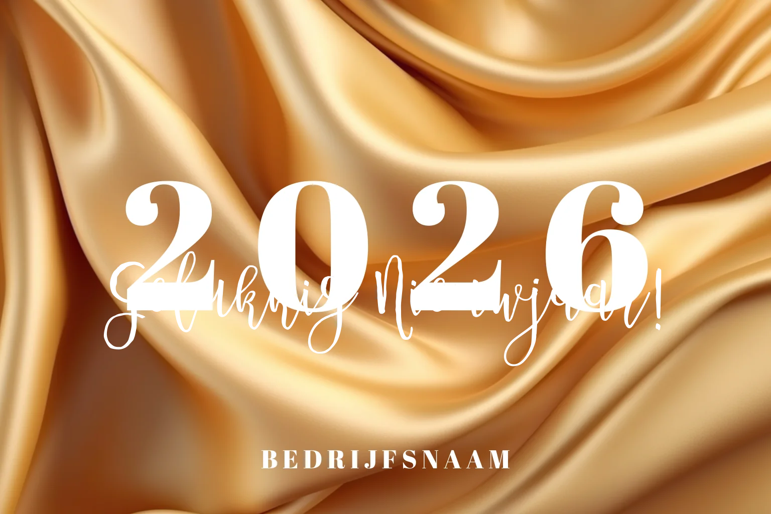 Mooie kerstkaart met goudfolie typografie, groot 2026 en een weelderige gouden stof als achtergrond. De sierlijke achtergrond in combinatie met goudfolie zorgt voor een luxe uitstraling. Wens uw zakelijke contact een gelukkig nieuwjaar met deze bijzondere kaart!