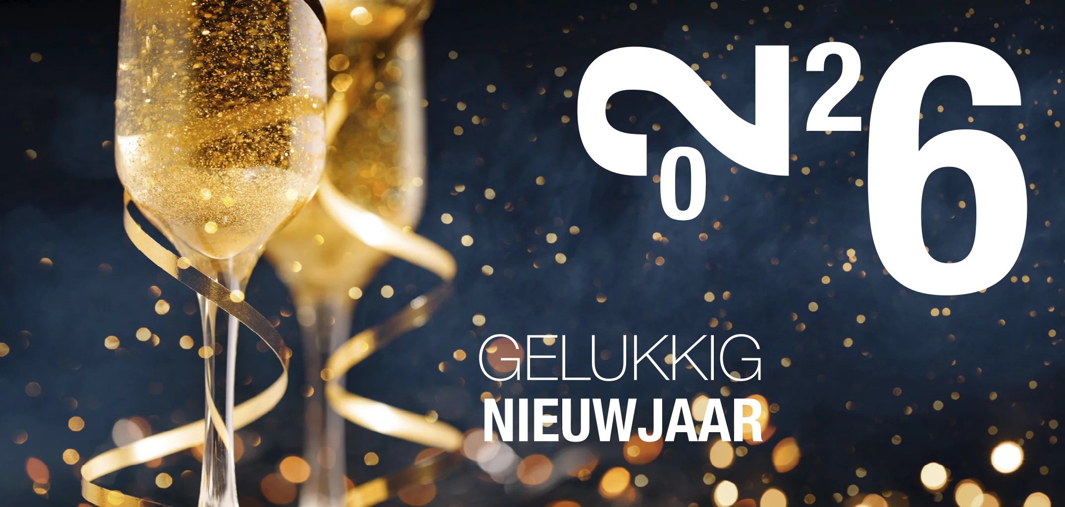 Nieuwjaarskaart met champagne en 2026 in goudfolie
