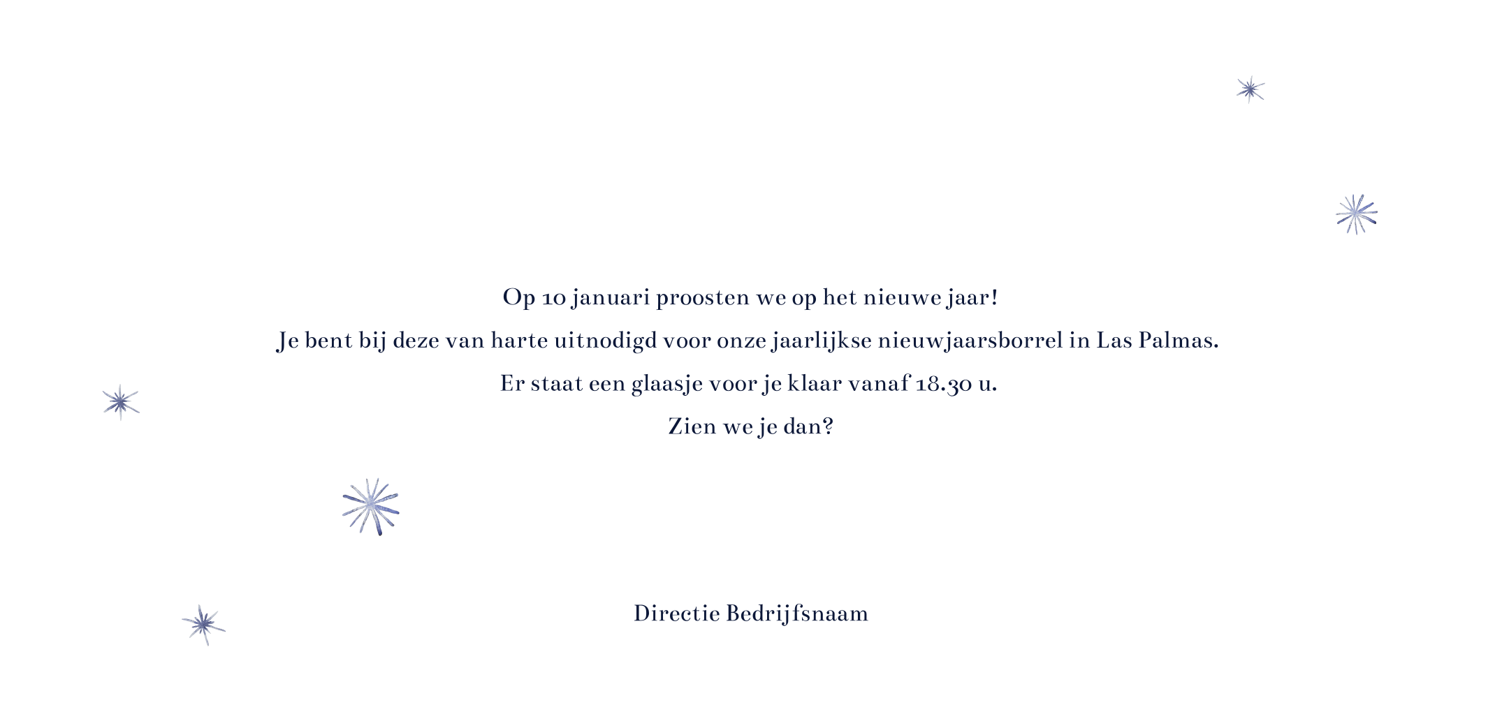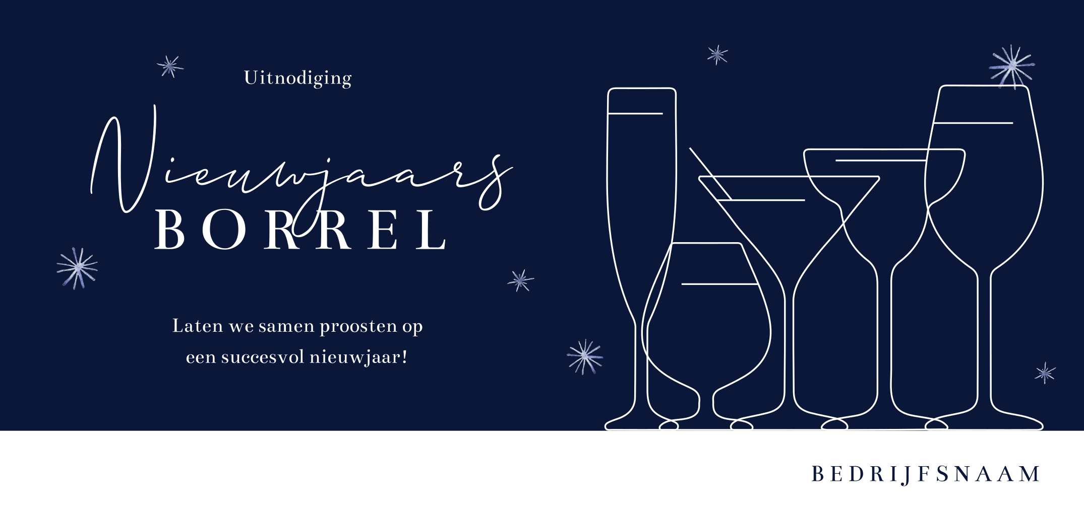 Viert uw bedrijf een feestje ter ere van het nieuwe jaar? Nodig alle medewerkers, klanten of zakelijke contacten uit met deze chique kaart in donkerblauw en goud. In glimmend goudfolie komt er een lijntekening van glazen voorop. De kaart wordt verder aangekleed met blauwe sterretjes. Personaliseer deze kaart met onze editor en nodig iedereen uit in stijl voor de nieuwjaarsborrel!