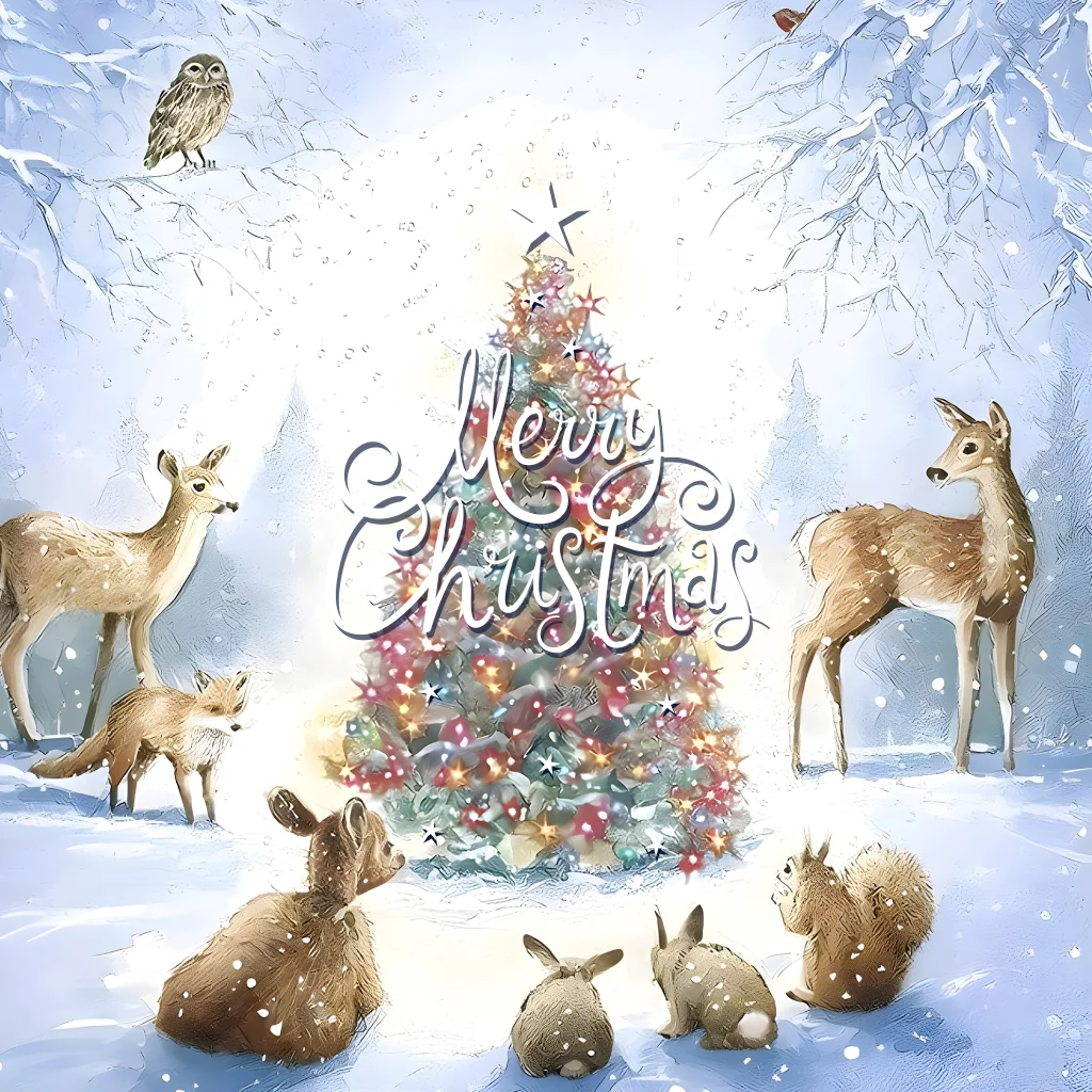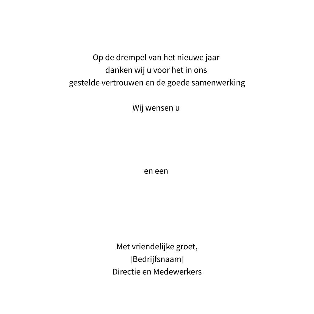 Verstuur deze mooie kerstkaart met winters tafereel naar al uw zakelijke contacten om ze prettige feestdagen toe te wensen. Op de voorkant staat een kerstboom, versierd met goudfolie sterretjes, met daaromheen allerlei bosdieren in de sneeuw. De typografie in goudfolie maakt het geheel af. Pas deze kaart zelf aan in onze ontwerptool.