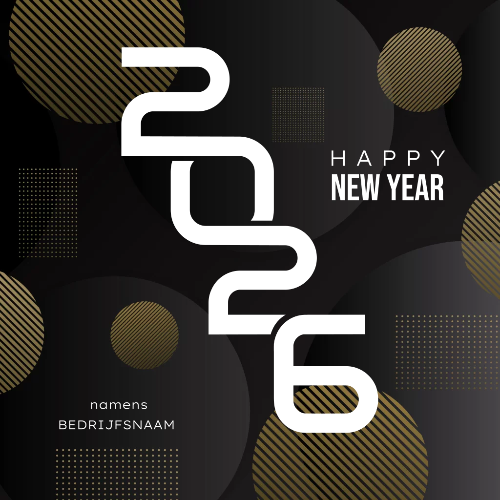 Zwarte kerstkaart met 2026 in goudfolie. Stijlvolle zwarte kerstkaart met grafische goudkleurige bollen. Pas deze kaart eenvoudig aan in de designtool en stuur hem naar uw zakelijke relaties.