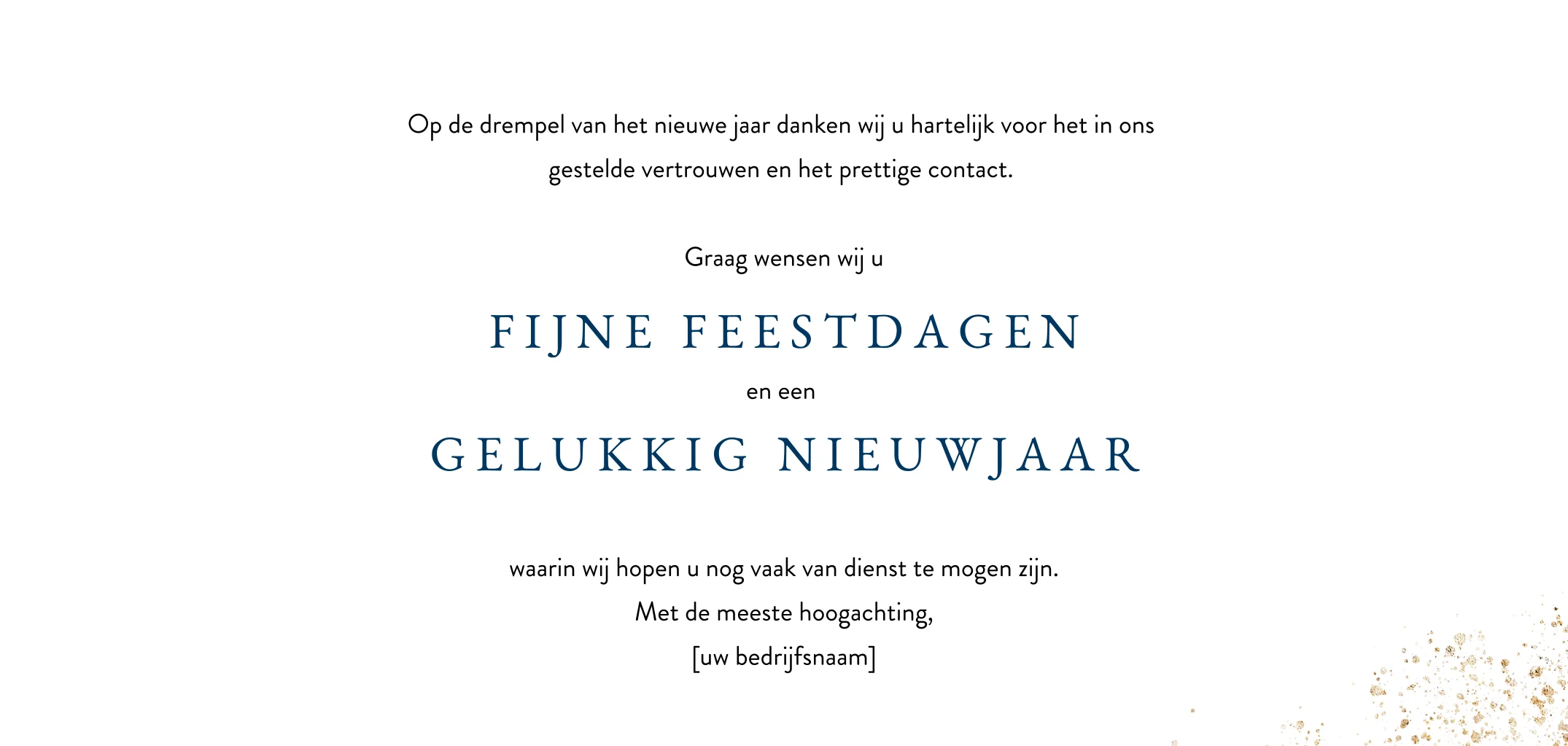Mooie panorama kerstkaart met een donkerblauwe waterverf achtergrond en gouden spetters. Links op de kaart is ruimte voor een mooie foto van bijvoorbeeld een containerschip. Pas de kaart naar wens aan en bestel een proefdruk.