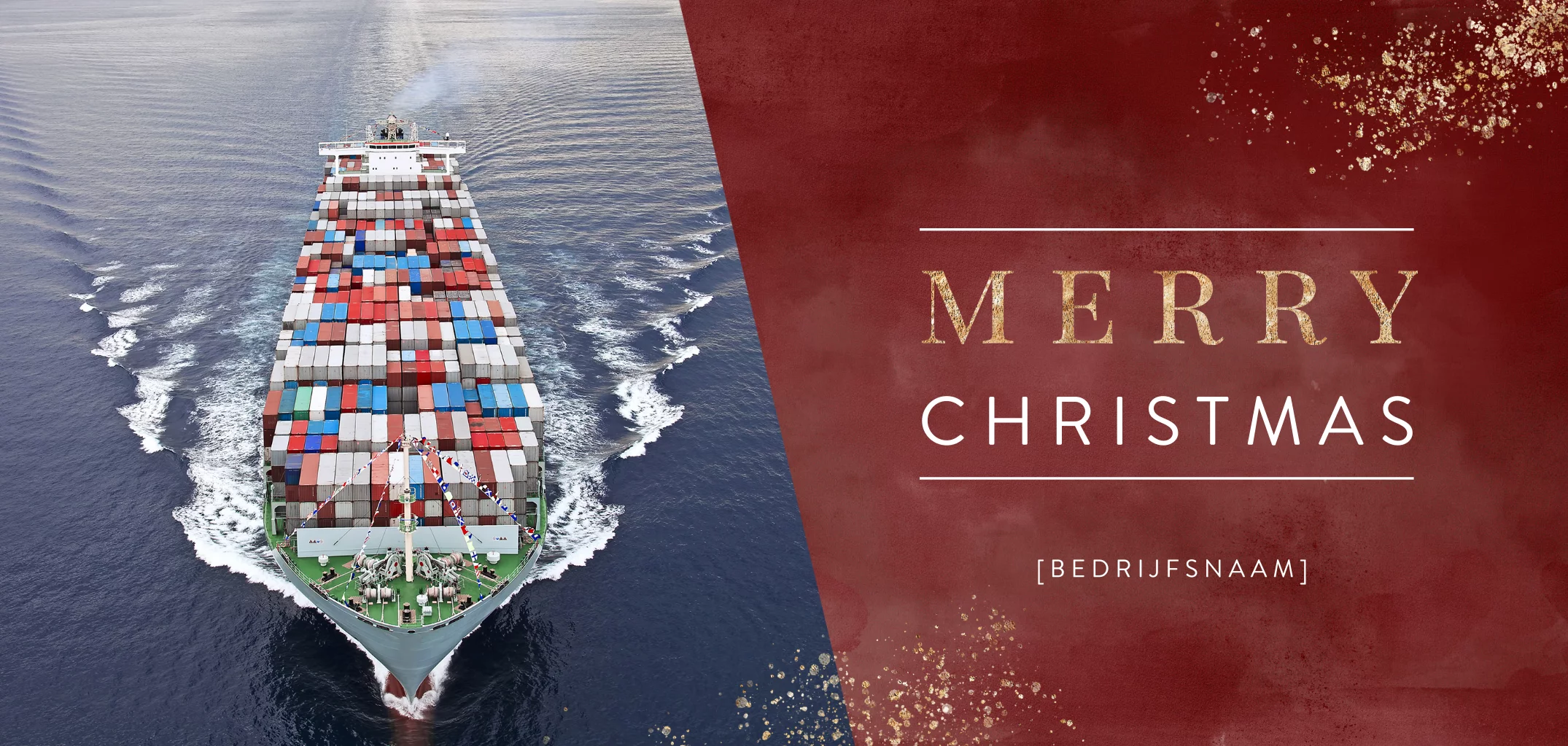 Prachtige kerstkaart op panorama formaat. De kaart heeft een dieprode achtergrond, geschilderd met waterverf. Op de voorzijde staat een foto van een schip vol met containers. Hier kunt u natuurlijk ook een eigen foto plaatsen.