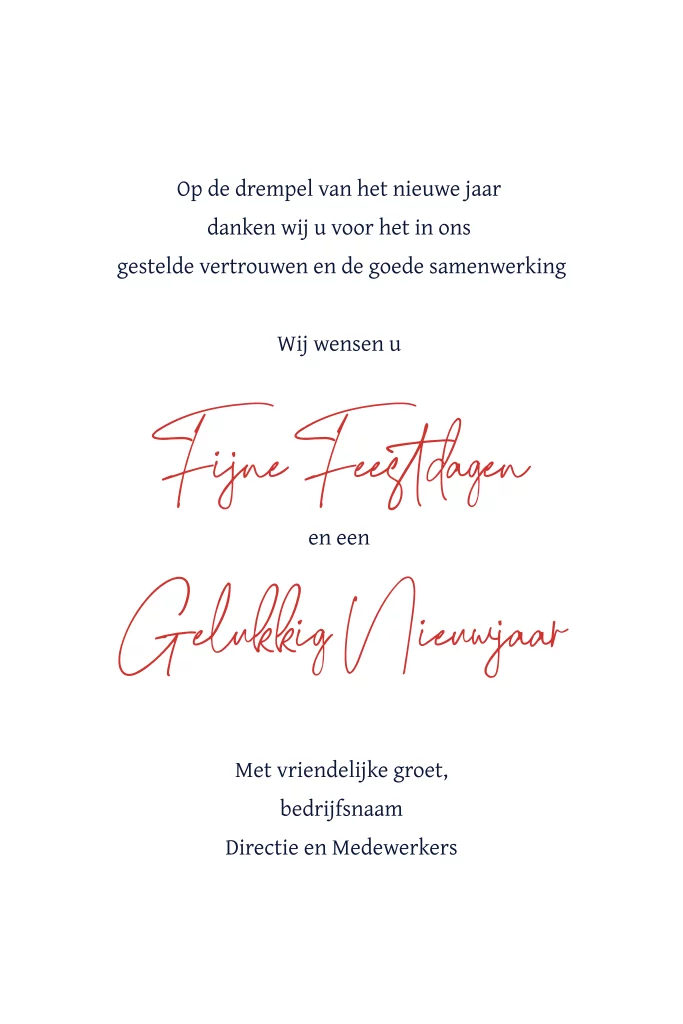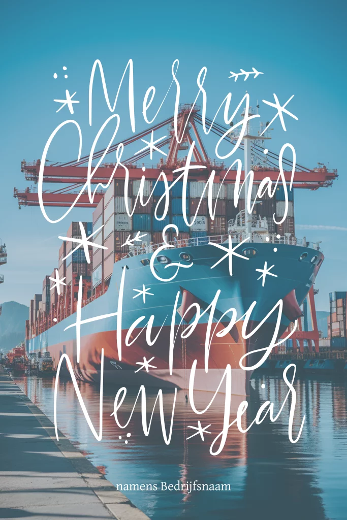 Deze moderne kerstkaart heeft een achtergrond van een imposant containerschip met een lichte blauwtint, zodat de tekst "Merry Christmas & Happy New Year" in het wit duidelijk naar voren komt. De kaart is ideaal voor haven- of containerbedrijven en biedt de mogelijkheid om de achtergrond te vervangen door een eigen foto van uw bedrijf, schip of haven. De kaart is volledig aanpasbaar via de editor, zodat u de tekst en boodschap kunt personaliseren. Een stijlvolle en professionele manier om uw klanten en relaties fijne feestdagen te wensen, perfect voor de maritieme sector.