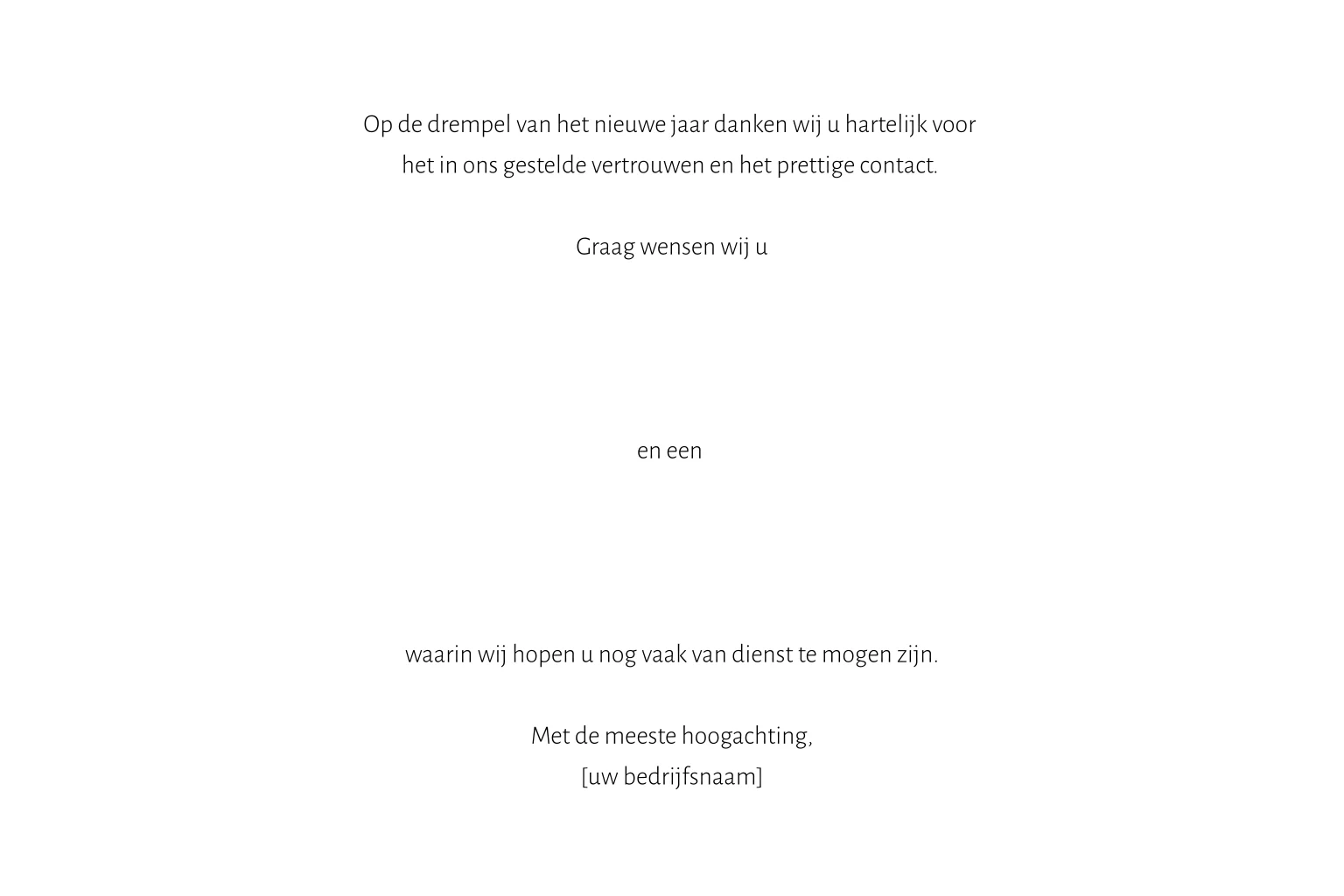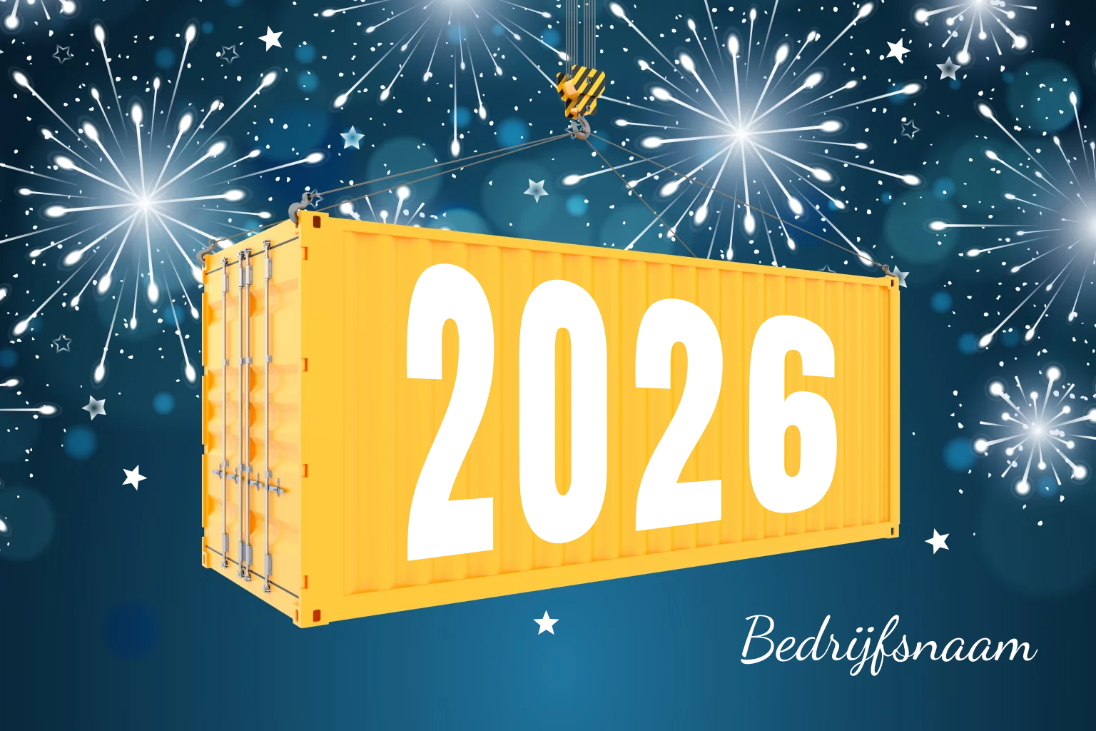 Op zoek naar een unieke kerstkaart? Verstuur deze opvallende kaart met zilverfolie jaartal 2026 op de gele container. De kaart wordt verder versierd met feestelijk vuurwerk en zilveren sterretjes. Uw bedrijfsnaam komt voorop in glimmende letters. Aan de binnenzijde is ruimte voor uw logo en een persoonlijke kerstgroet aan al uw zakelijke contacten.