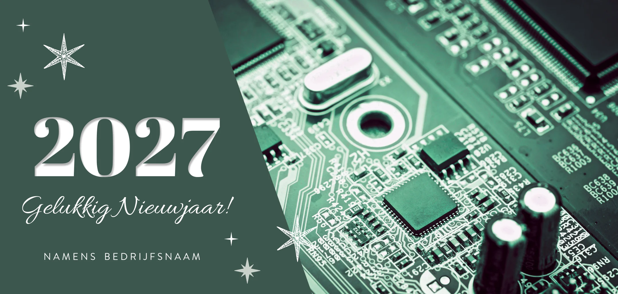 Als ICT bedrijf op zoek naar een toepasselijke kerstkaart voor alle zakenrelaties? Dan is dit stijlvolle ontwerp iets voor u. De kaart heeft een prachtige groene kleur en is versierd met goudfolie sterren. De kaart is met een schuin vlak in twee delen verdeeld. U kunt op de linkerkant een eigen foto kwijt. Maar u kunt natuurlijk ook onze foto gebruiken.