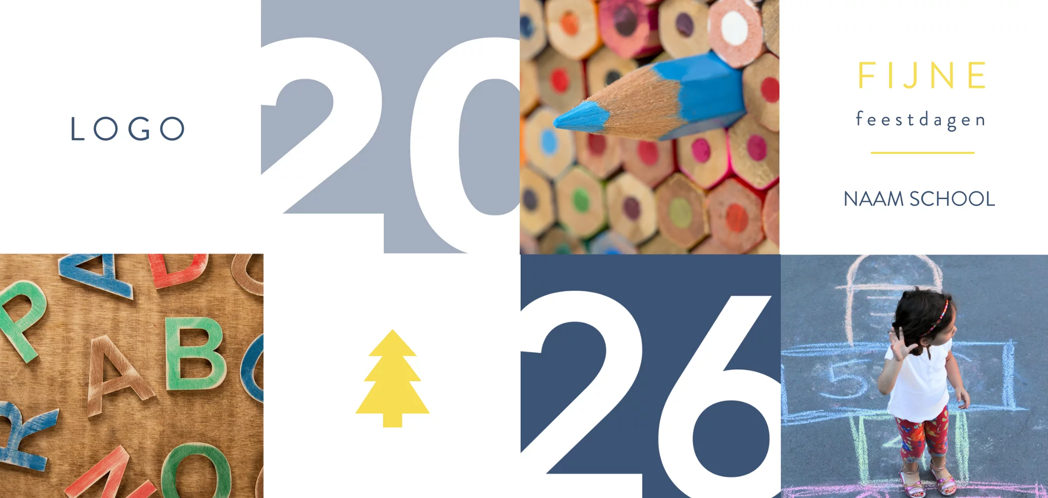 Op zoek naar een mooie kerstkaart voor uw onderwijsinstelling? Dit grafische ontwerp met blauwe vlakken past daar precies bij! De kaart is opgedeeld in 8 delen en heeft ruimte voor 3 foto's. Ook is er ruimte voor uw logo en de bedrijfsnaam. De foto's kunt u in onze designtool vervangen door eigen beelden. Op deze manier maakt u uw kerstkaart extra persoonlijk.