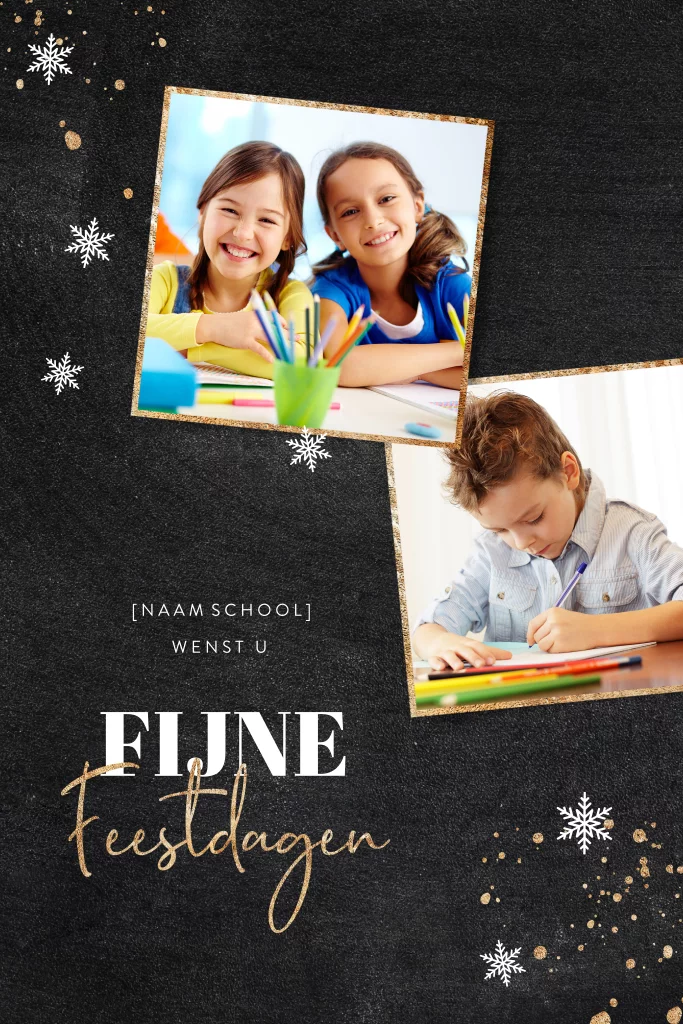Verstuur dit jaar een stijlvolle kerstkaart met dit klassieke ontwerp. Dit donkere ontwerp met goudkleurige spetters heeft een achtergrond van krijtbord, een knipoog naar het onderwijs. In de fotokaders kunt u twee foto's van uw school en/of personeel plaatsen. De sneeuwsterren maken het ontwerp helemaal af. Pas de kaart naar wens aan en bestel een drukproef op een papiersoort naar keuze.