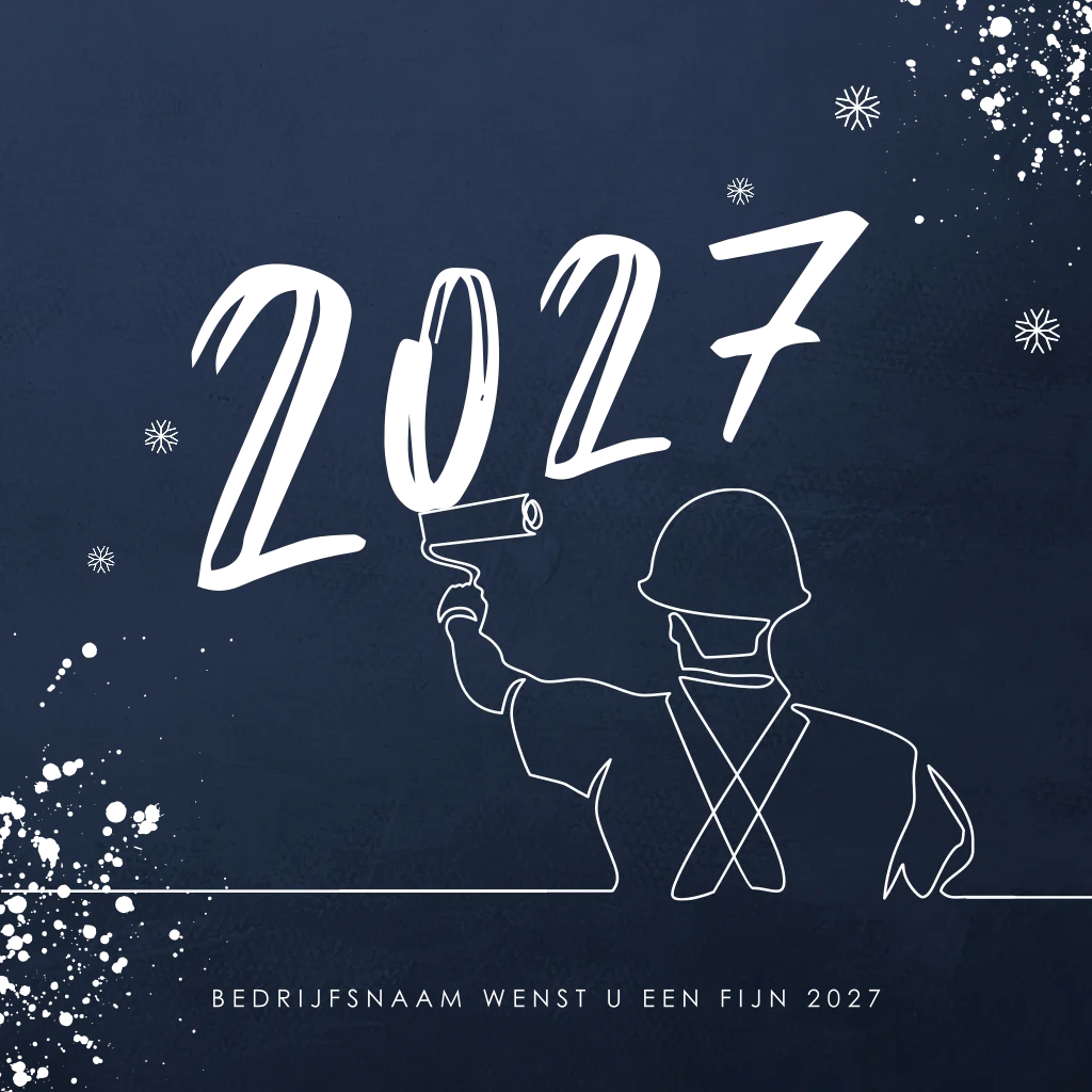 Op zoek naar een toepasselijke kerstkaart voor uw schildersbedrijf? Dit vierkante ontwerp met diepblauwe achtergrond, goudfolie spetters en oneline illustratie van een schilder is perfect. Het jaartal 2027 spat door de goudfolie van de kaart af. Maak de kaart verder af in de designtool.