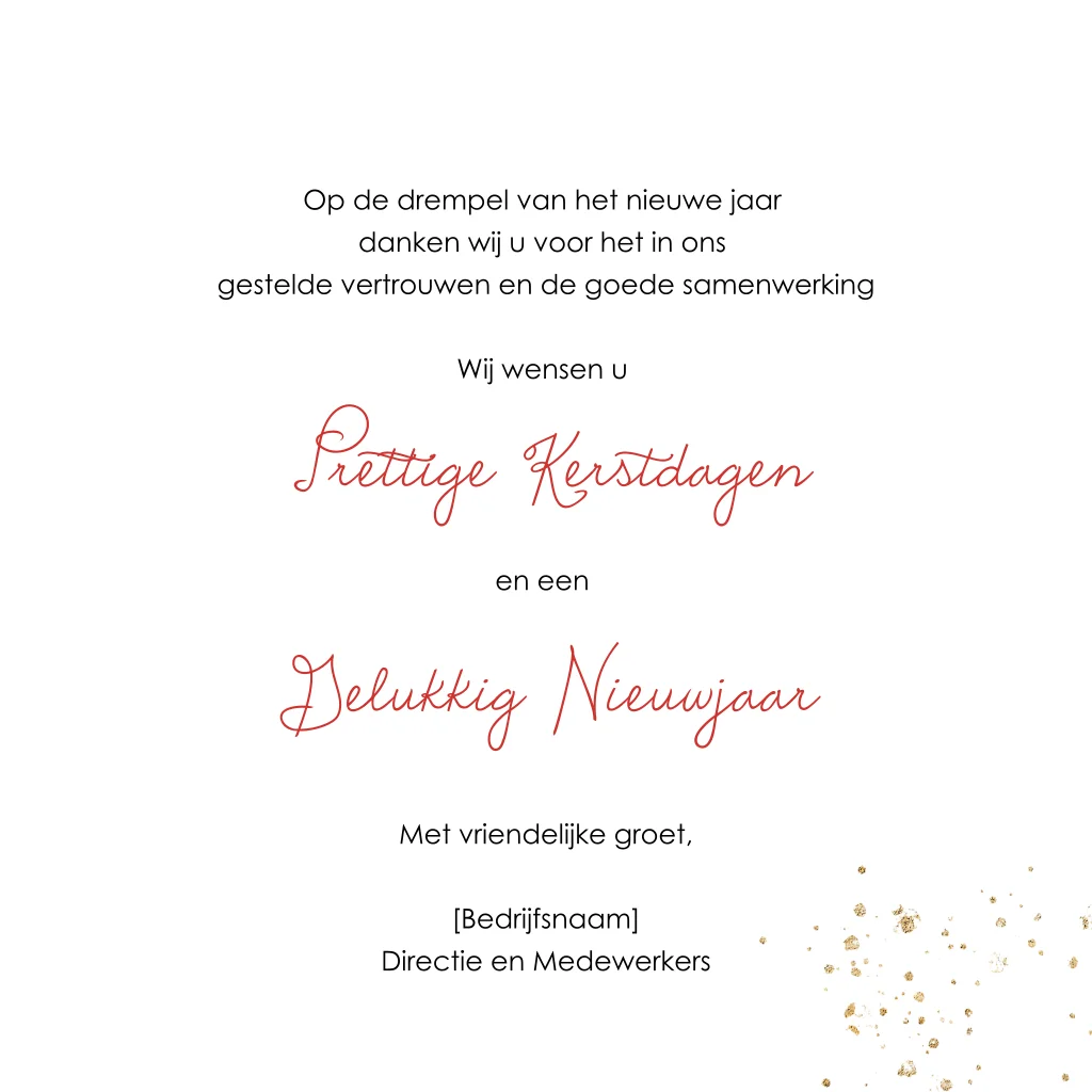 Mooie, stijlvolle kerstkaart met goudkleurige kaders. De kaart is versierd met spetters en witte sterren. In de kaders is ruimte voor drie foto's. U kunt uw eigen beelden toevoegen of gebruik maken van onze mooie foto's. De donkerrode achtergrond matcht mooi met de goudkleurige accenten. Bestel een drukproef om de kaart in het echt te bekijken.
