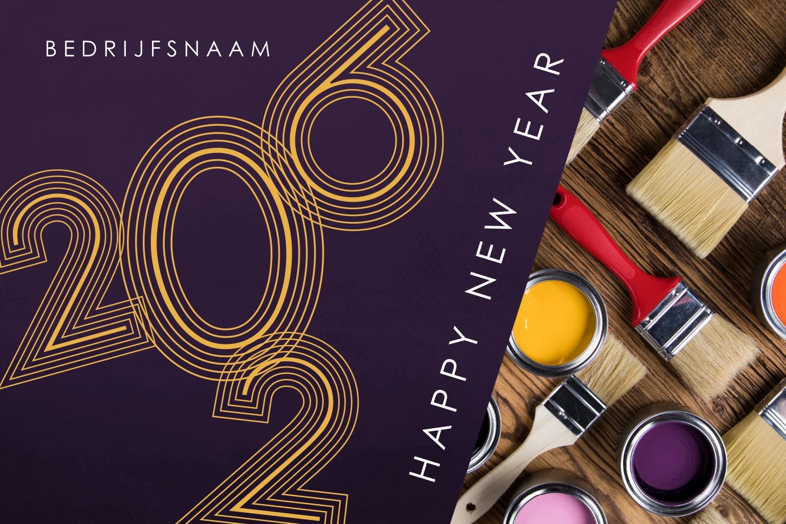 Mooie zakelijke kerstkaart met donkerpaarse achtergrond. Het schuine kader heeft ruimte voor een staande foto. U kunt een eigen beeld toevoegen maar ook onze foto van verfpotten en kwasten gebruiken. Het jaartal 2026 staat op grafische wijze groot op de voorkant.