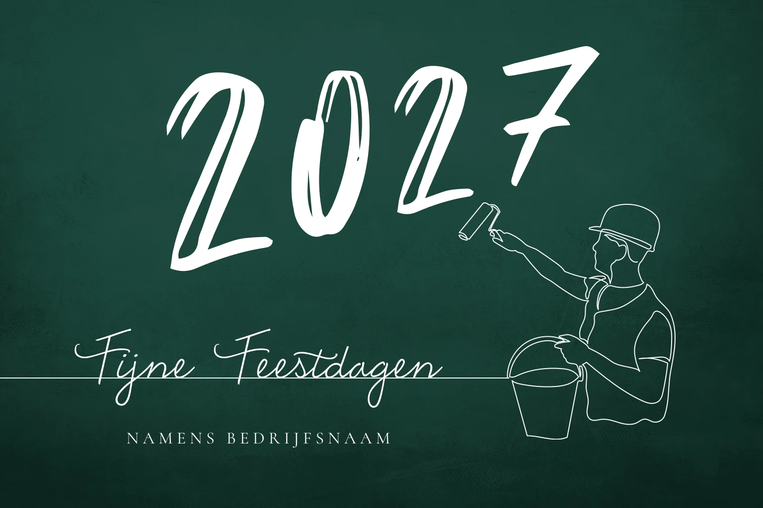 Groene kerstkaart voor de schildersbranche met mooie donkergroene achtergrond. Hierdoor komen de goudfolie cijfers van het jaartal 2027 extra naar voren. Ook staat er een strakke lijntekening van een schilder op de voorzijde. Het lijkt alsof hij het jaartal schildert. Pas de lettertypes en kleuren naar wens aan en bestel een drukproef.