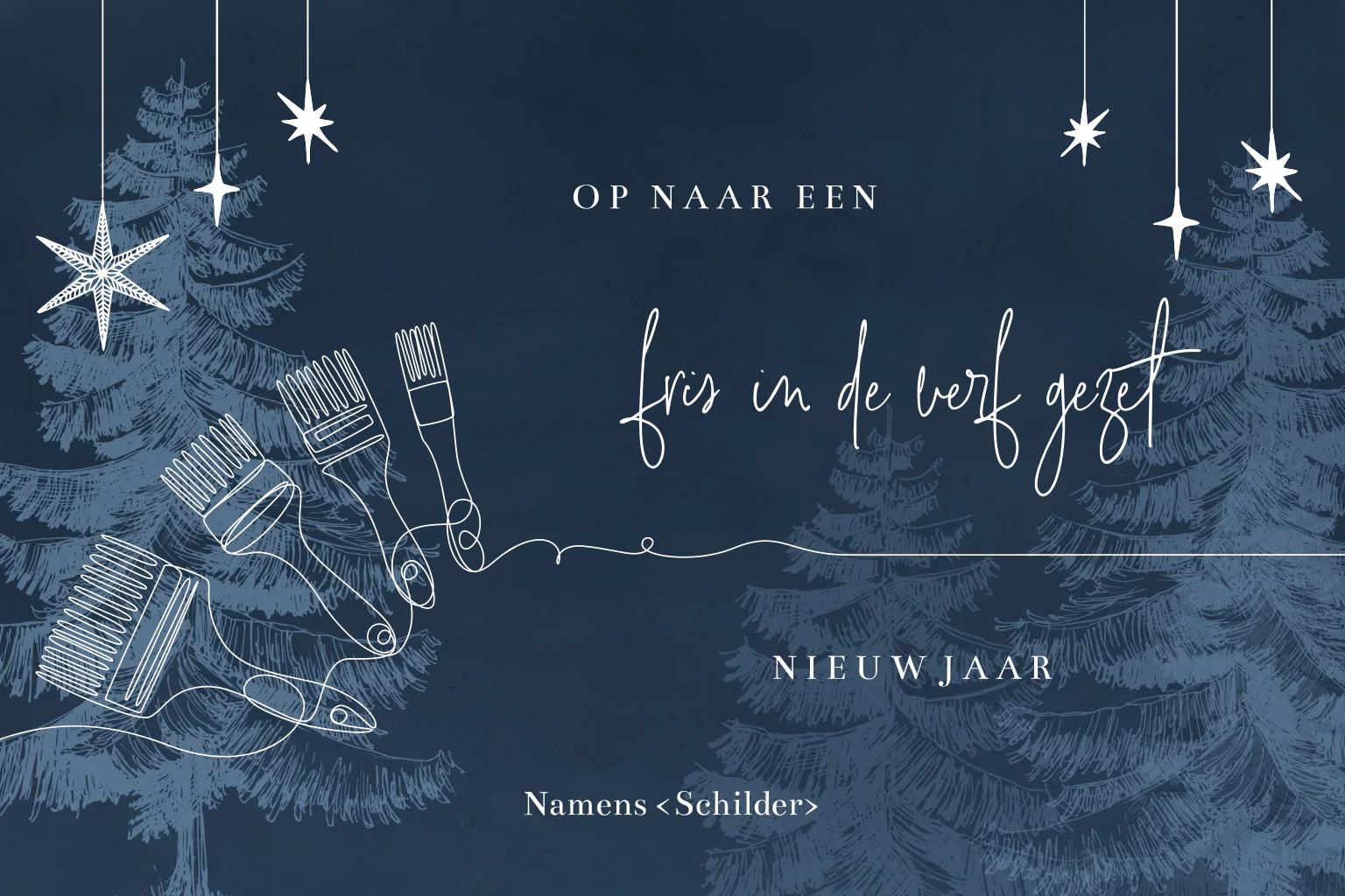 Wens klanten en relaties een vrolijk nieuwjaar met deze zakelijke kerstkaart speciaal voor schilders en onderhoudsbedrijven. De illustratie met kwasten en sterren geeft een creatieve en professionele uitstraling. Perfect voor een schilderbedrijf dat op een originele manier verbonden wil blijven met klanten tijdens de feestdagen.