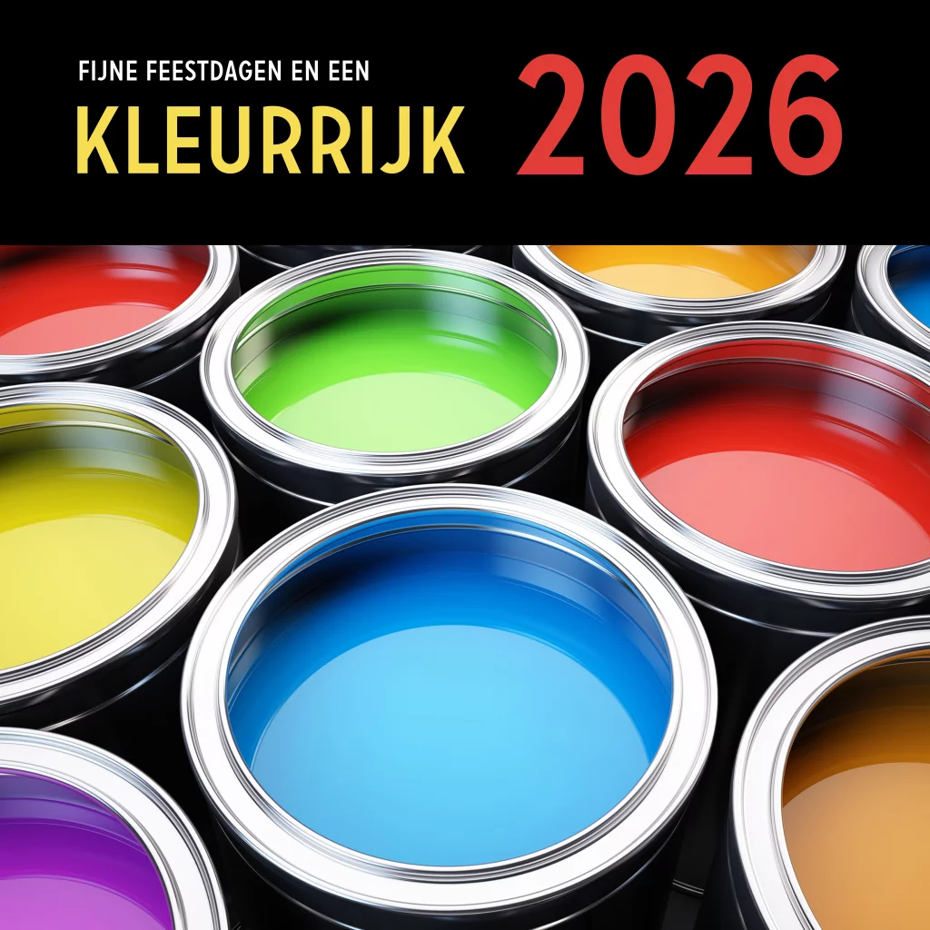 Bent u schilder en wilt u een toepasselijke kerstkaart sturen naar uw klanten en relaties om ze te bedanken voor het afgelopen jaar? Stuur dan deze zakelijke kerstkaart met kleurrijke verfblikken en sterren en de toepasselijk tekst 'Fijne Feestdagen en een Kleurrijk Nieuwjaar'. U kunt deze tekst aanpassen met uw eigen tekst. Aan de binnenzijde is ruimte om ook uw logo te plaatsen.