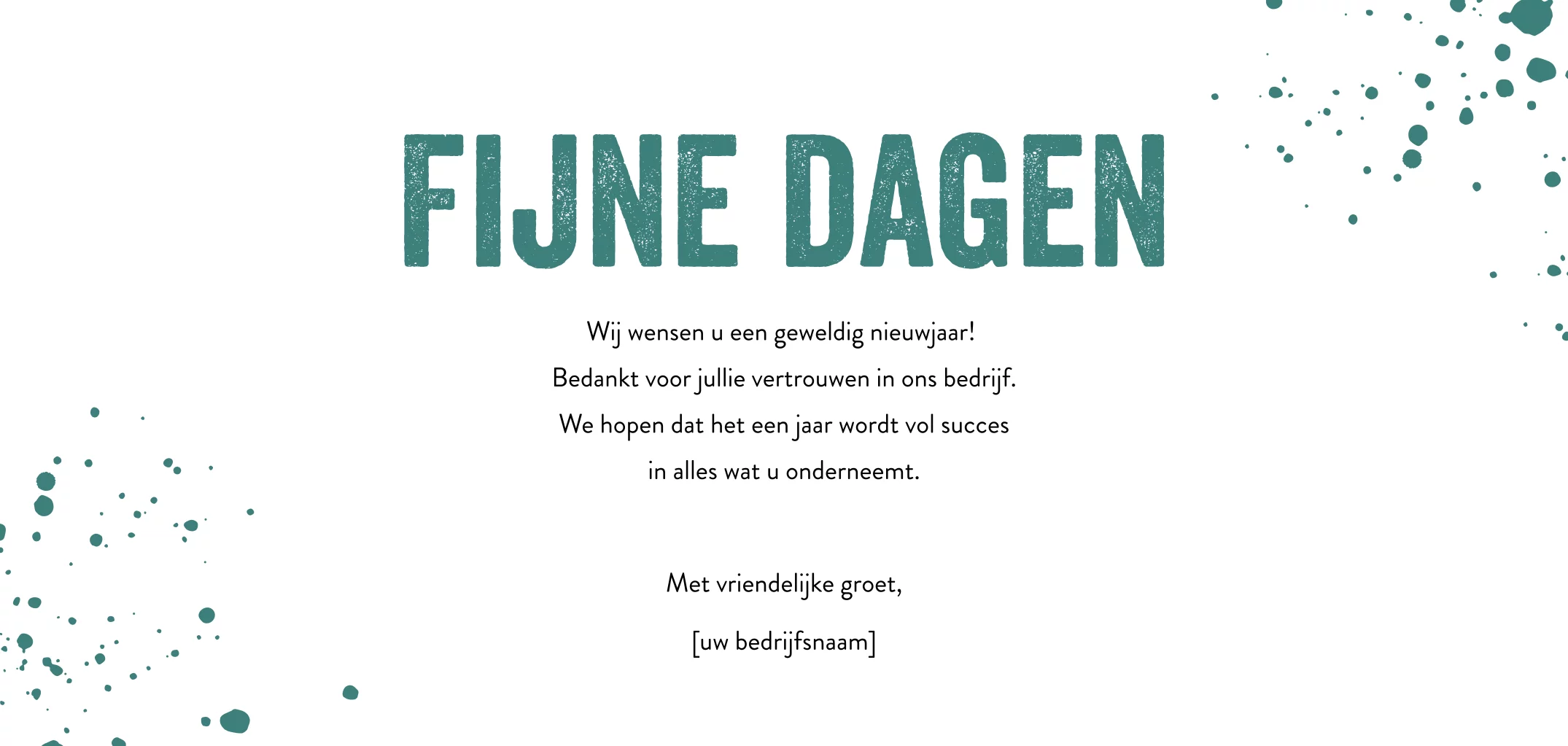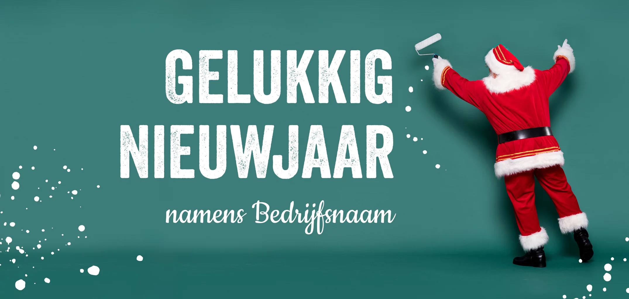 Op zoek naar een leuke nieuwjaarskaart voor uw schildersbedrijf? Ga voor dit vrolijke ontwerp met groenblauwe achtergrond, schilderende kerstman en opvallende typografie! De witte verfspetters zorgen voor de finishing touch. Wens uw klanten, team of andere zakelijke contacten een gelukkig nieuwjaar met dit originele kaartje.