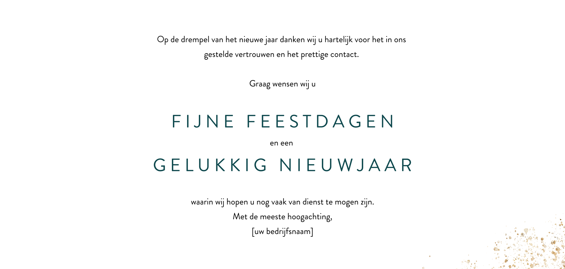 Zakelijke kerstkaart met zachtgroene waterverf en aan de linkerzijde ruimte voor drie mooie transport foto's. De gouden spetters en witte ijssterren maken de kaart tot een mooi geheel. Heb je zelf foto's die je wilt toevoegen? Geen probleem, met de designtool kun je de foto's eenvoudig wijzigen.