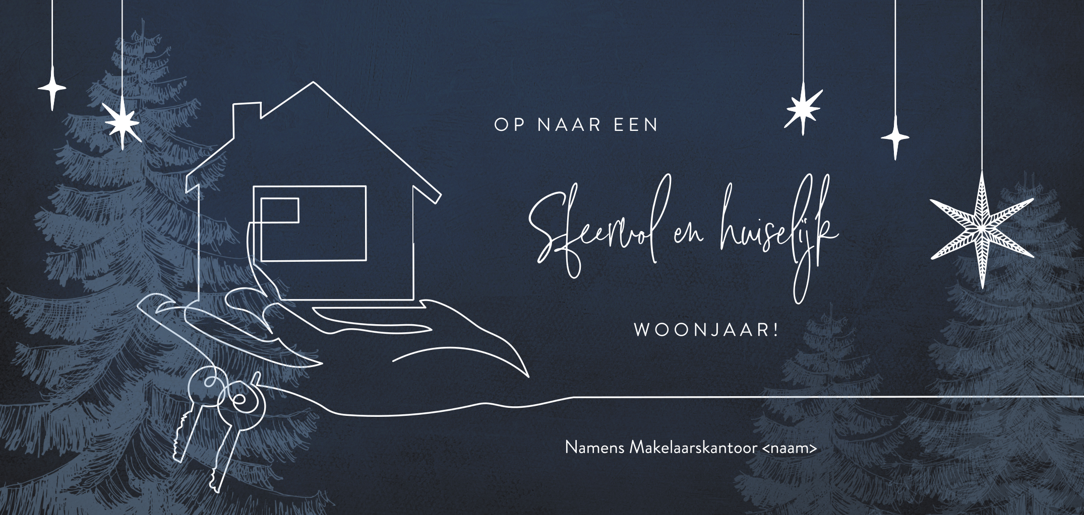 Chique kerstkaart voor makelaars met donkerblauwe achtergrond en hangende sterren in goudfolie. Lichte kerstbomen op de achtergrond en kleine witte sterretjes maken het geheel extra feestelijk. Mooie oneline illustratie van een hand met sleutel en huis.