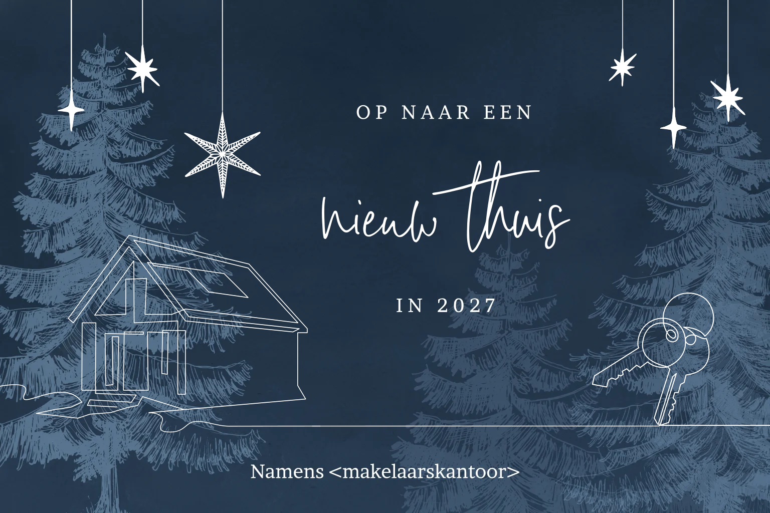 Verras klanten en relaties met deze stijlvolle zakelijke kerstkaart voor makelaars en vastgoedkantoren in donkerblauw met goudfolie. Met de vloeiende illustratie van een huis en sleutels wens je een succesvol en vertrouwd nieuwjaar. Perfect om waardering te tonen aan kopers, verkopers en zakenpartners, en om als makelaarskantoor persoonlijk contact te onderhouden tijdens de feestdagen.