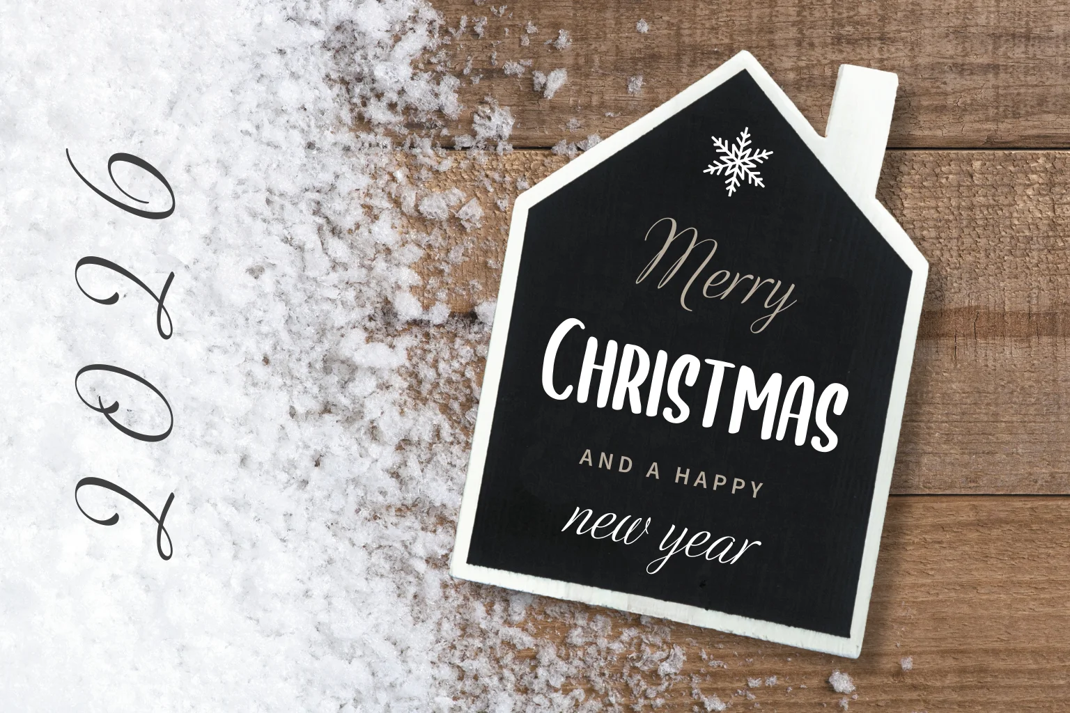 Zakelijke kerstkaart voor makelaars. Achtergrond hout met sneeuw en daarop een krijtbord huisje met daarin de kerstwens. Pas zelf de teksten aan en bestel een proefdruk!