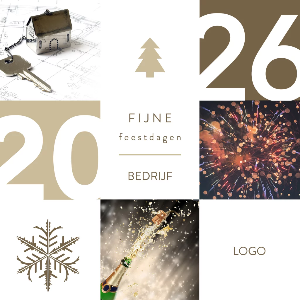 Kerstkaart vastgoed met 2026, foto's en bruine vlakken