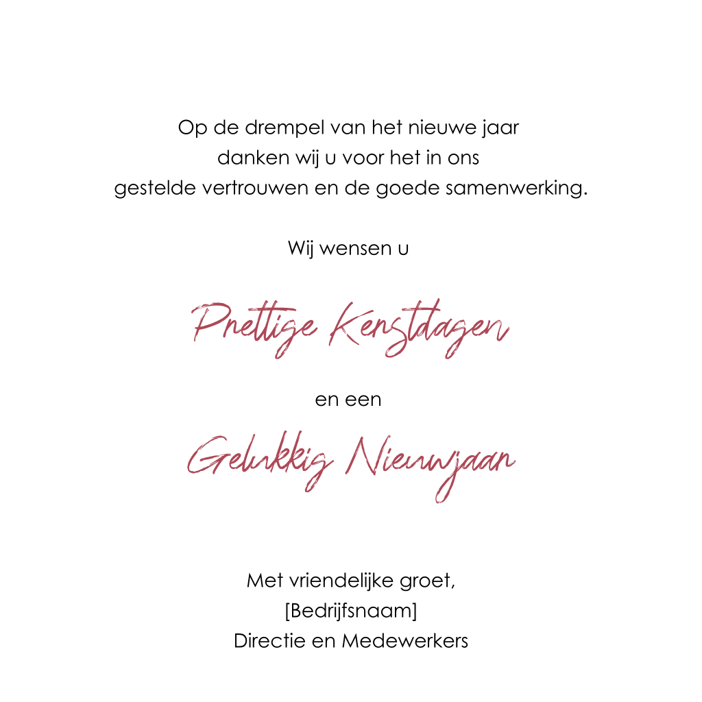 Wilt u uw waardering uitspreken voor de toewijding en inzet van uw fijne werknemers? Verstuur deze donkerroze kerstkaart met goudfolie en bedank het kloppende hart van uw bedrijf voor hun bijdrage van het afgelopen jaar. Op de voorzijde staat in gouden letters BEDANKT, met daaronder 'Jullie zijn toppers!'. Daaronder is ruimte voor uw logo. Pas deze kaart zelf aan in onze handige editor.
