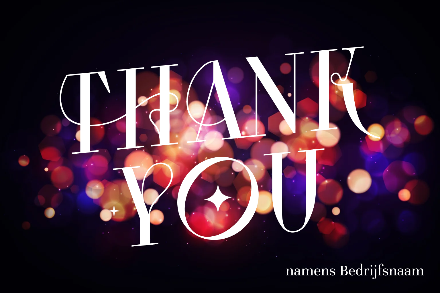 Feestelijke kerstkaart om uw team te bedanken voor hun inzet van het afgelopen jaar. In prachtige regenboogfolie letters komt groot 'Thank you' voorop te staan, boven op een sprankelende en kleurrijke achtergrond. In de hoek is ruimte voor uw bedrijfsnaam. Toch liever goudfolie? Dat kan! Pas deze kaart eenvoudig naar eigen wens aan in onze ontwerptool.