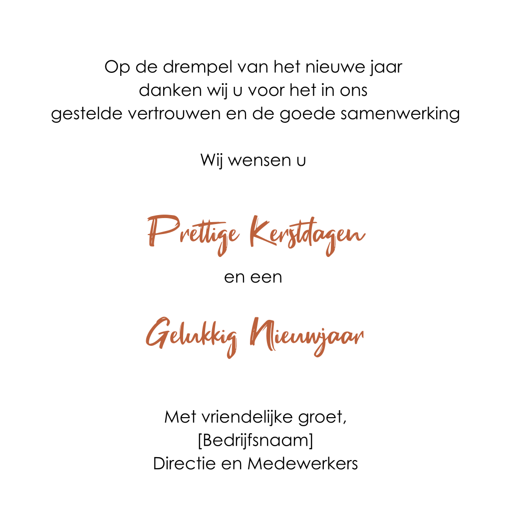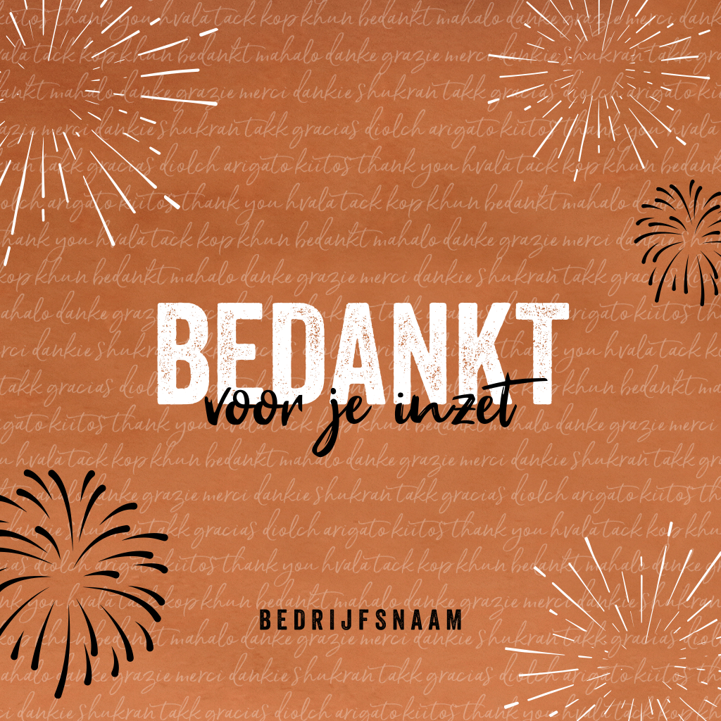 Mooie kerstkaart met roestbruine achtergrond en typografie met de tekst 'bedankt' in verschillende talen. Met stoere robuuste typografie staat er nogmaals bedankt op de voorzijde.