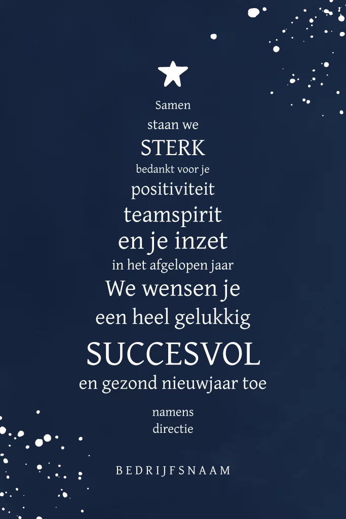 Een elegante kerstgroet met een diepblauwe achtergrond en een stijlvolle typografische kerstboom. Met deze unieke kerstkaart kunt u uw werknemers bedanken voor hun enthousiasme en inzet het afgelopen jaar. De geschreven tekst kunt u zelf nog aanpassen op de kaart. Onderaan het ontwerp is ruimte voor uw bedrijfsnaam en achterop kunt u ook uw logo en adres plaatsen.
