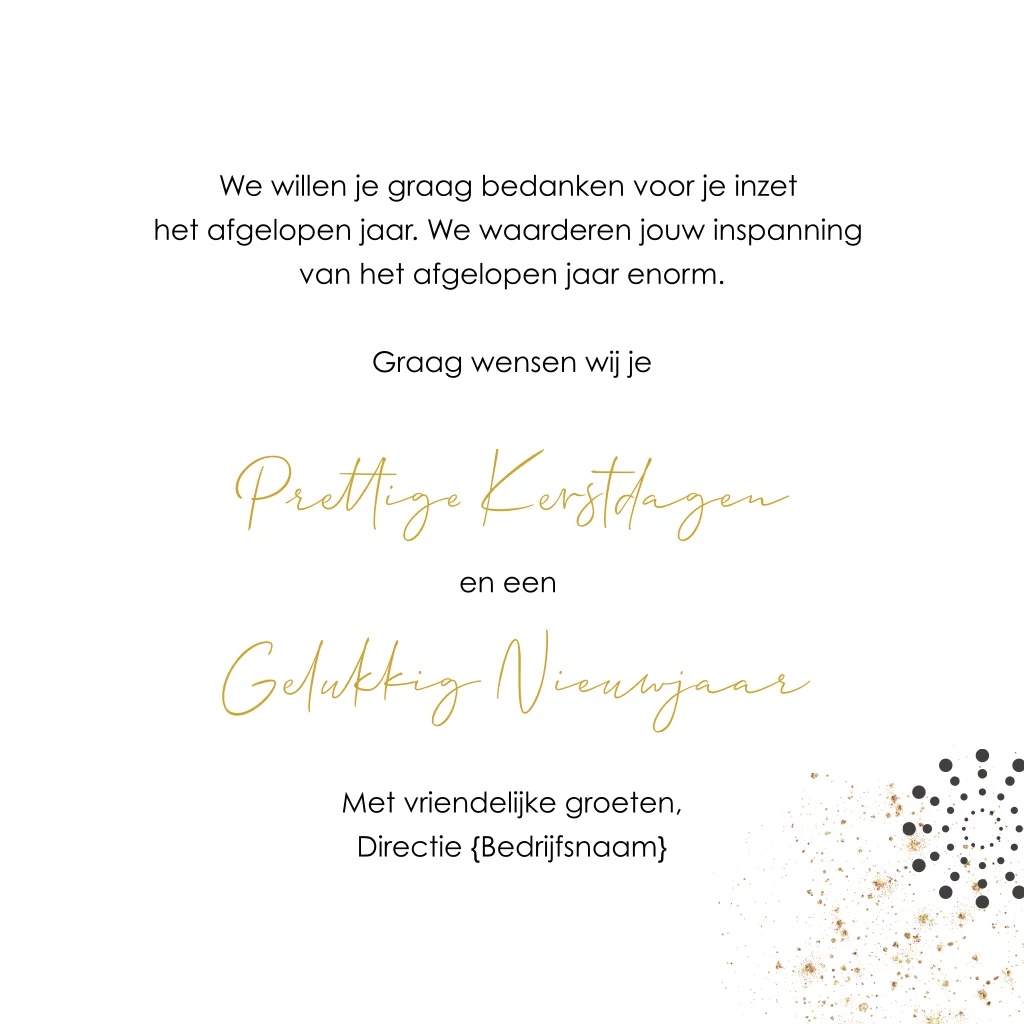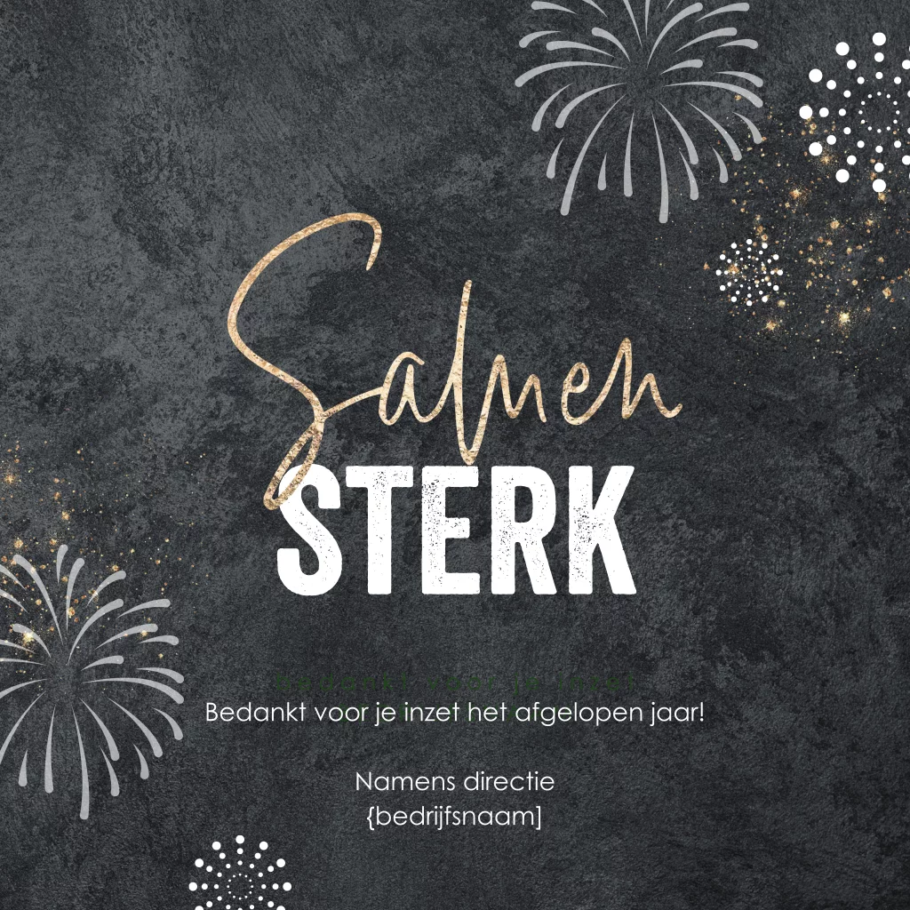 Wilt u uw medewerkers deze feestdagen een bedankje sturen voor hun inzet het afgelopen jaar? Stuur ze deze stoere kerstkaart met zwarte achtergrond en de toepasselijke tekst 'samen sterk' voorop. De illustraties van het vuurwerk maken de kaart extra feestelijk. Pas het ontwerp naar wens aan in de ontwerptool en bestel een drukproef.