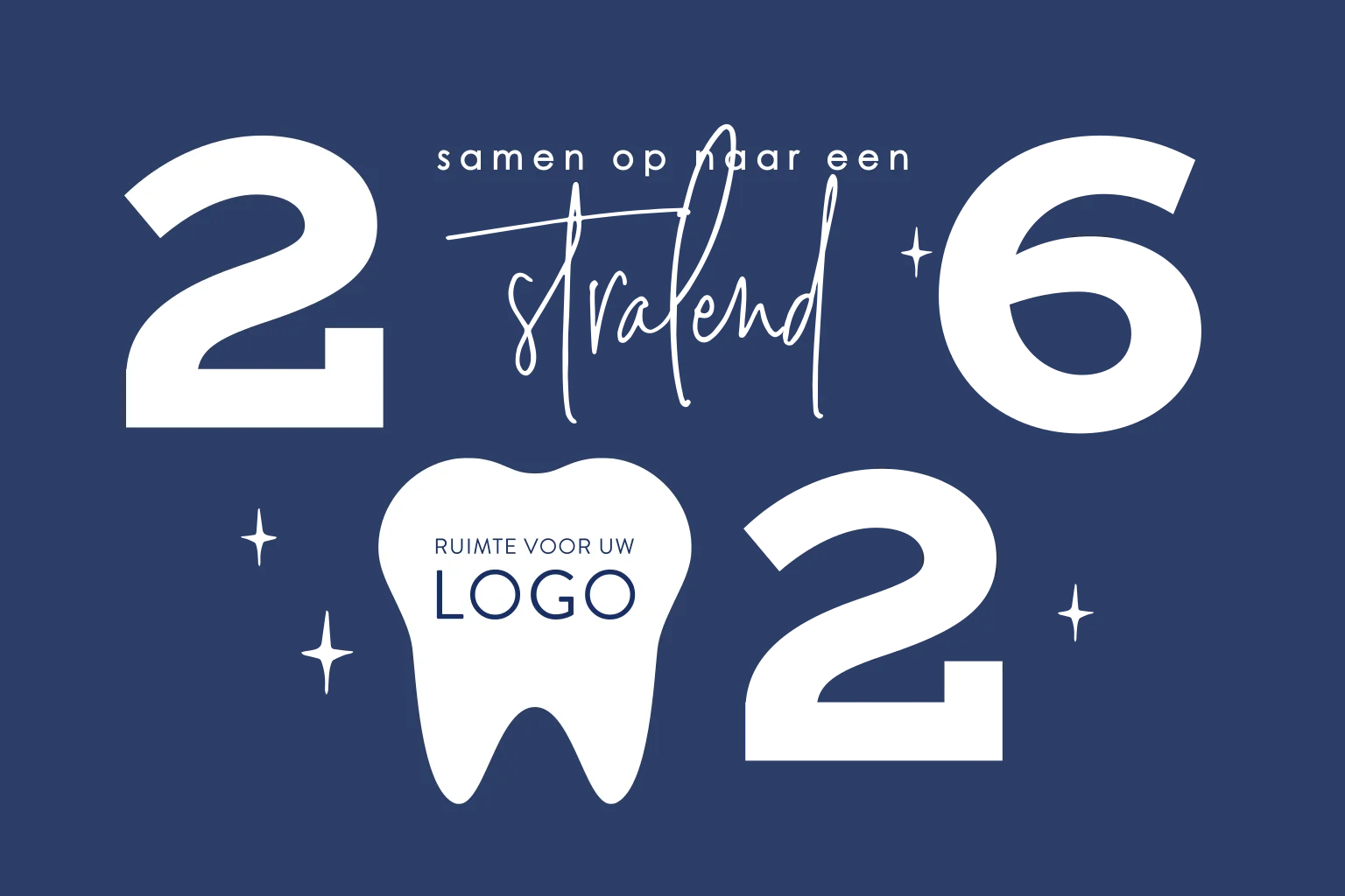 Wens uw zakelijke contacten een stralend nieuwjaar met deze goudfolie kerstkaart met jaartal, eigen logo en grote tand op de voorkant. Een perfecte kaart voor elk tandheelkundig bedrijf. De goudfolie typografie zorgt voor een chique uitstraling op de donkerblauwe achtergrond.